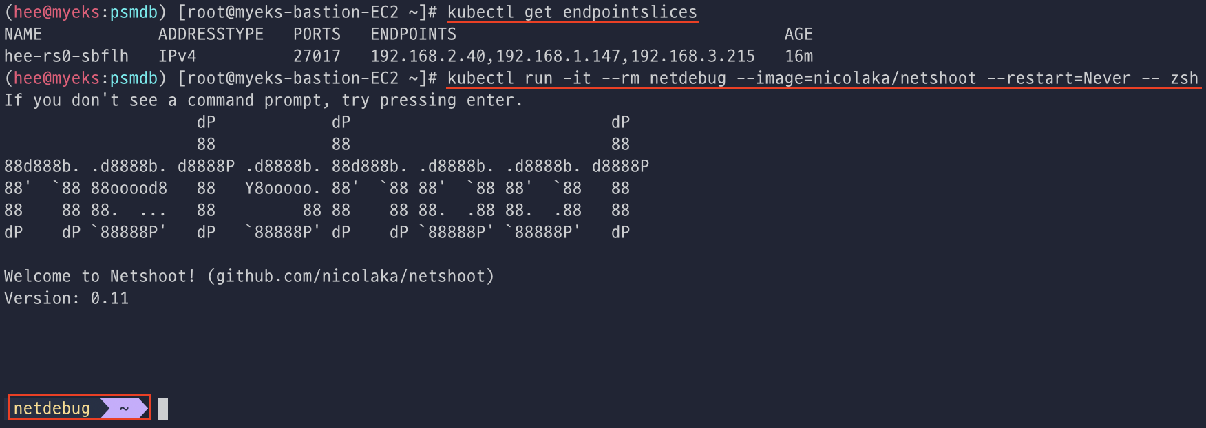 헤드리스 서비스 (service, endpoint) 확인 후 엔트포인트의 슬라이스 정보를 확인한다.