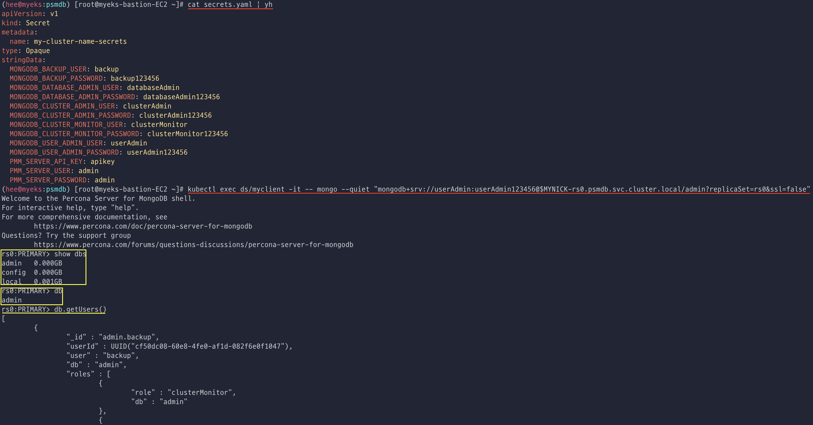 demonset의 이름으로 mongo pod 실행하고, 실행할 때 user계정과 password 서비스로 (admin)으로 접근하면, Primary DB로 접근한 것을 확인할 수 있다. DB에 접속해서 database, user 정보 등을 확인한다. (위에서 보았던 기본 계정들의 정보를 확인할 수 있다.)