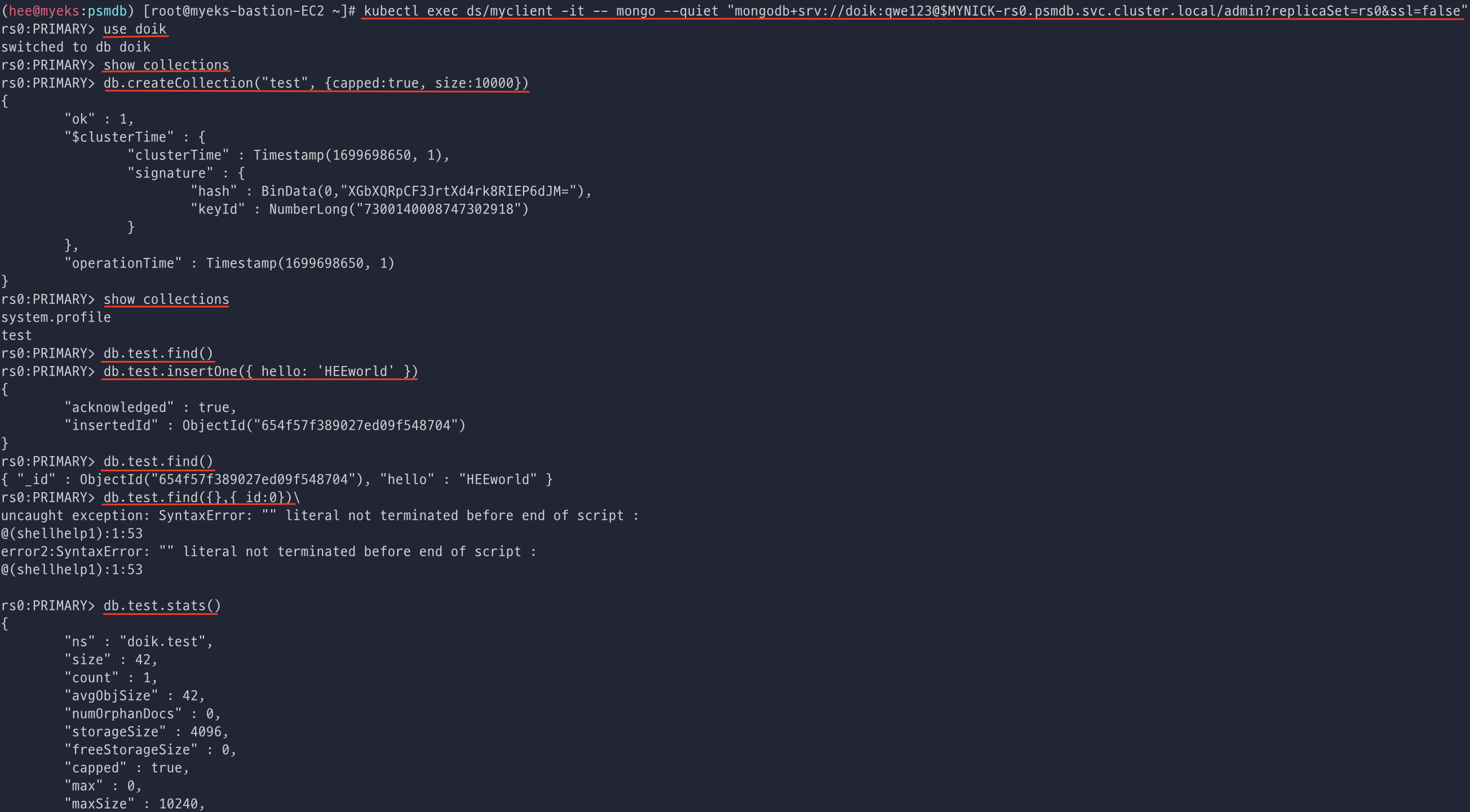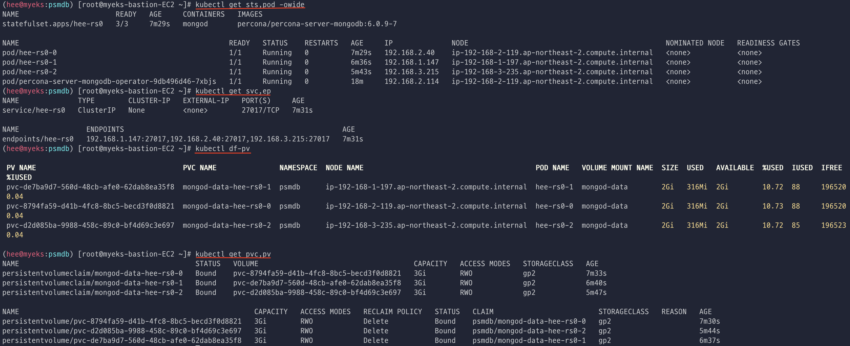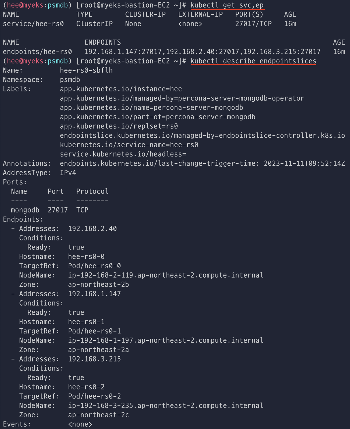 pod/hee-rs0-0이 아마 parimary DB일것이고 그 뒤로 생성되는 rs0-1, rs0-2가 standby DB로 생각된다.