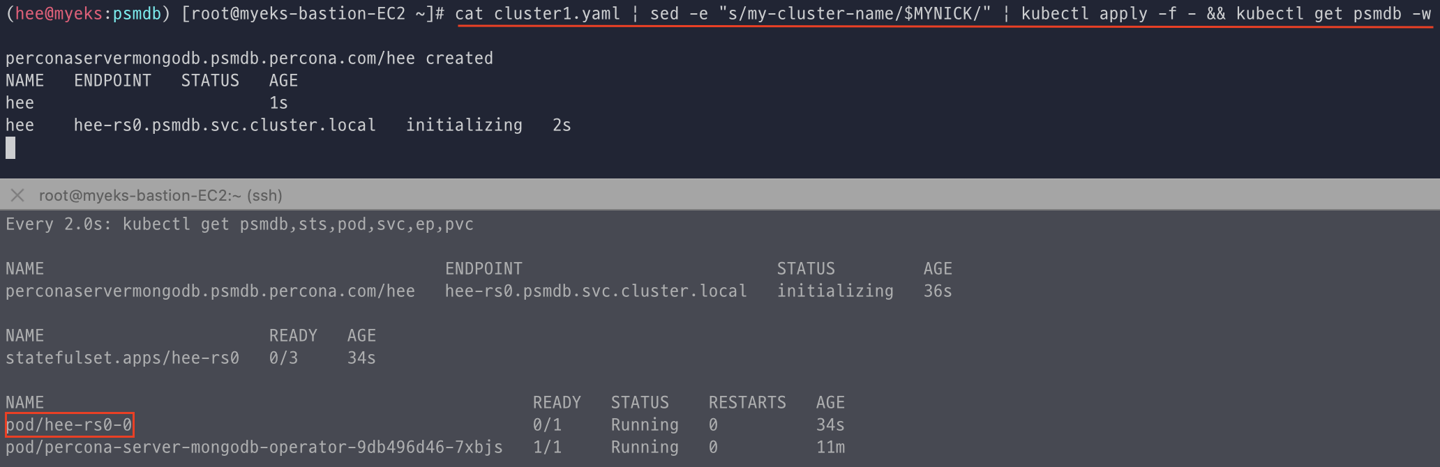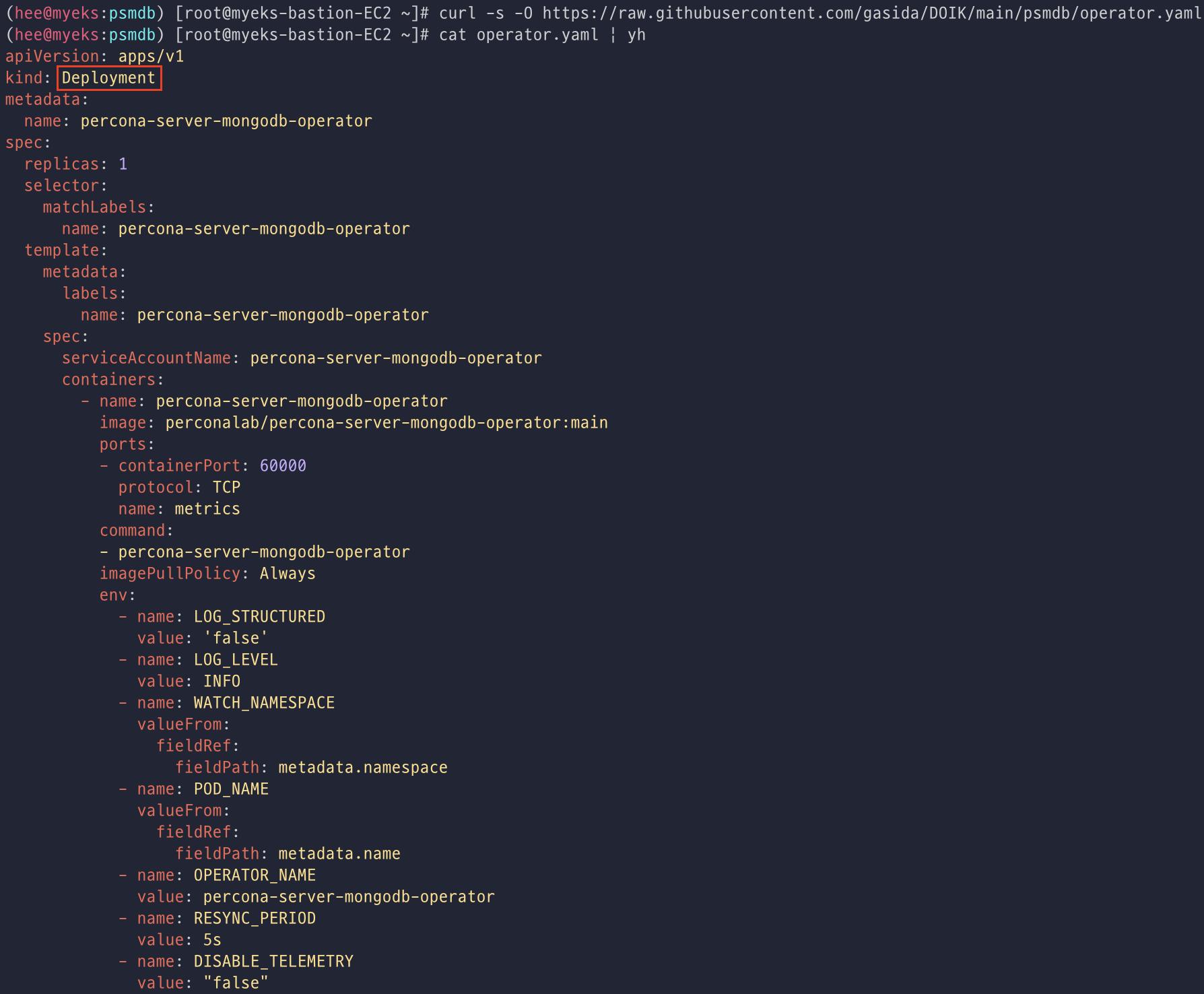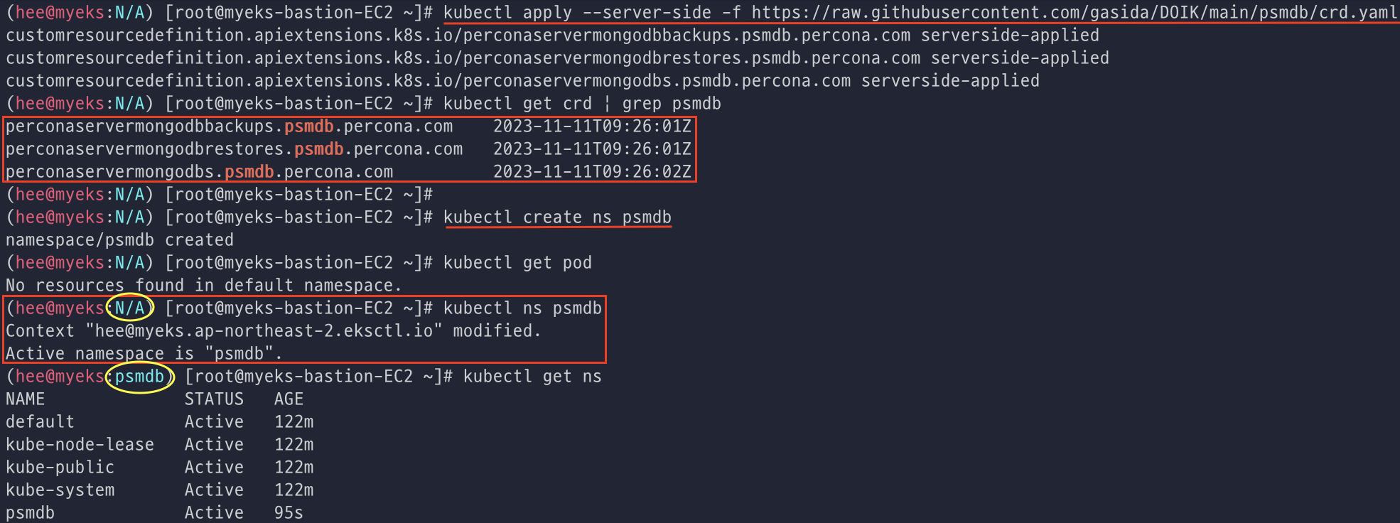 보면 myesk뒤에 N/A로 되어있던게, psmdb로 변경된 것을 확인할 수 있다. (Default ns 변경)