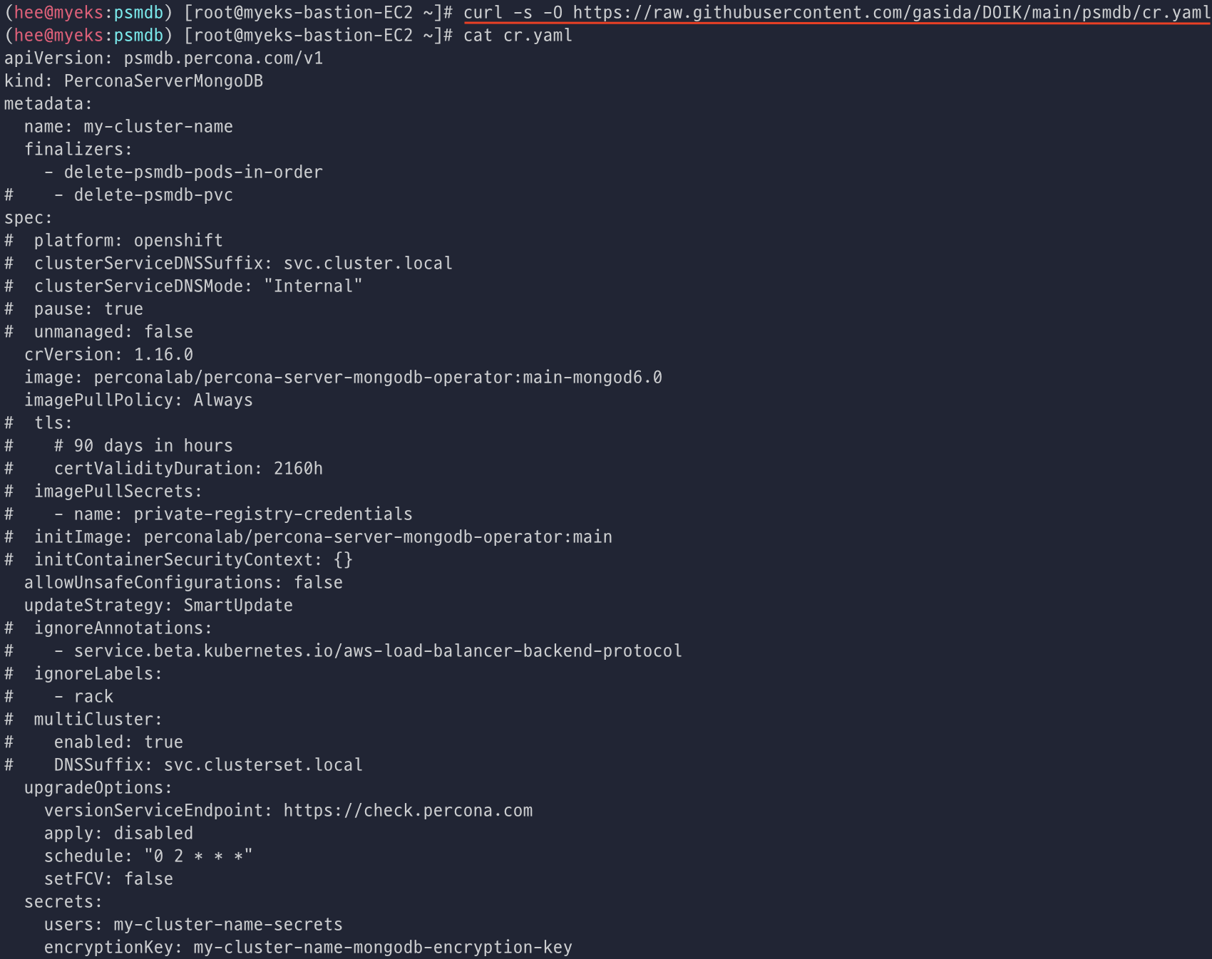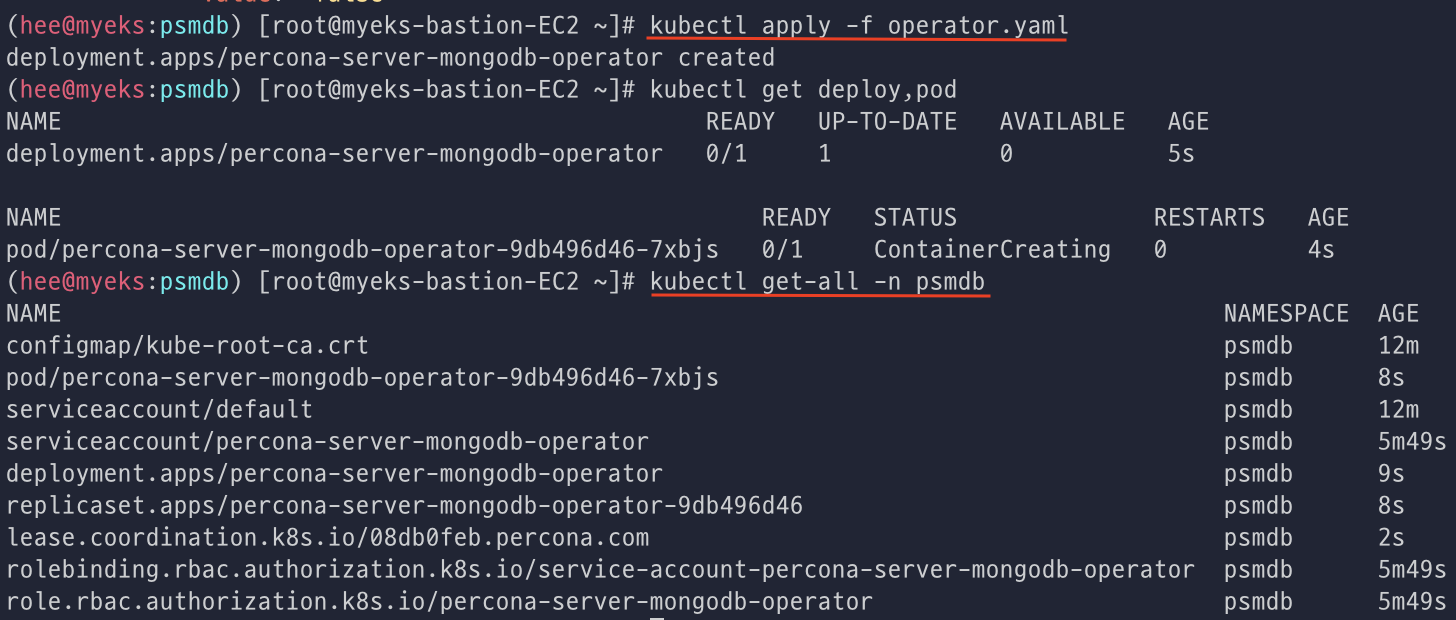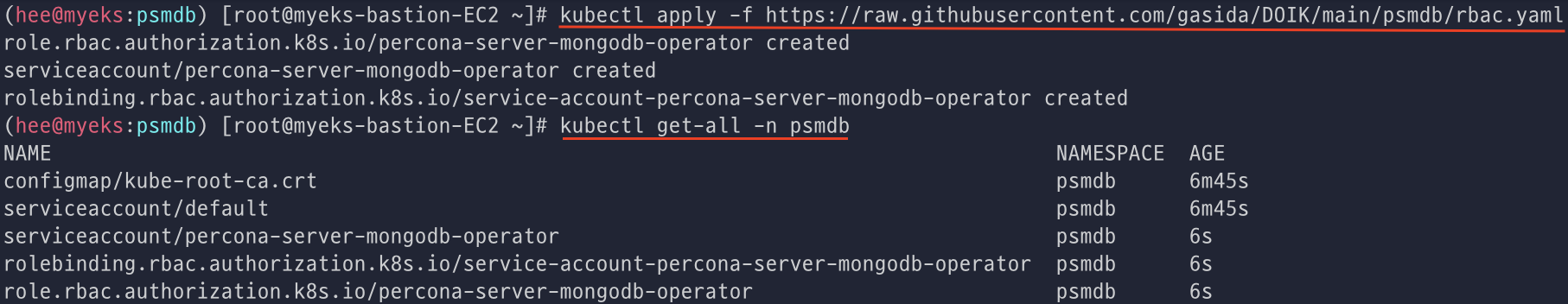 psmdb라는 새로운 namesapce를 생성하여, 앞으로 생성되는 모든 pod 등은 psmdb라는 namespace를 기본적으로 사용하도록 설정한다.
