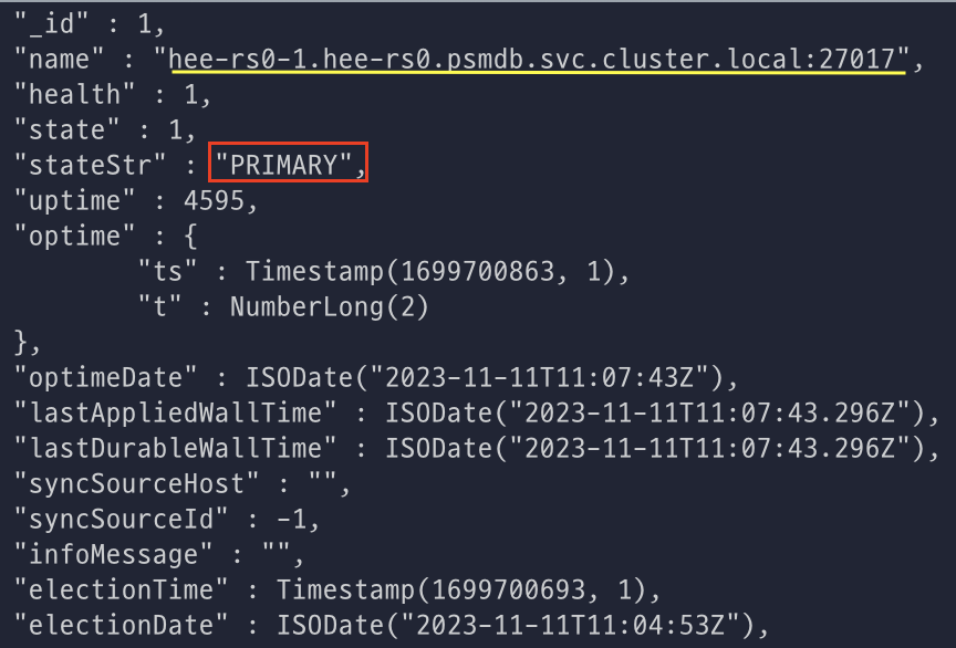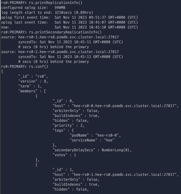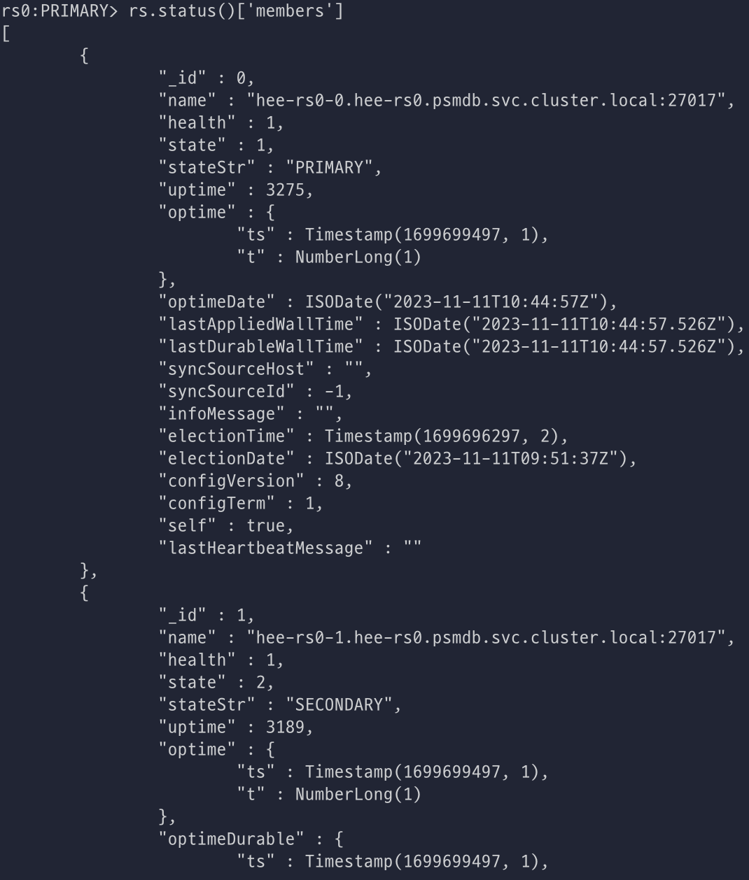 그리고 r0-1 Pod가 Primary로 승격된 것을 확인할 수 있다. 시간이 조금 지나면 rs0-0 pod도 다시 running 되어 primary 1개와 secondary 2개를 확인할 수 있다.