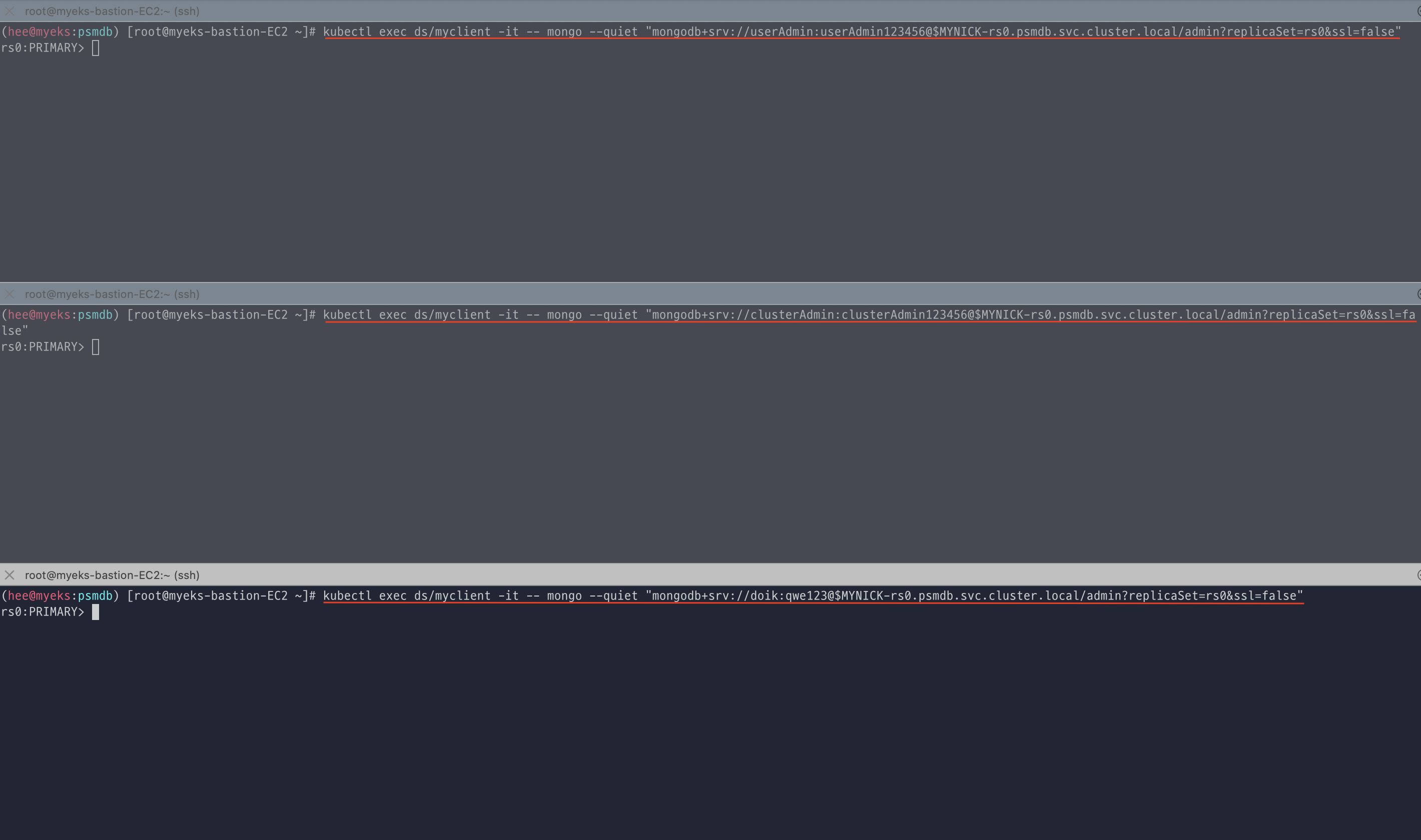 3개의 터미널에 각각의 user로 cluster 접속을 한다.