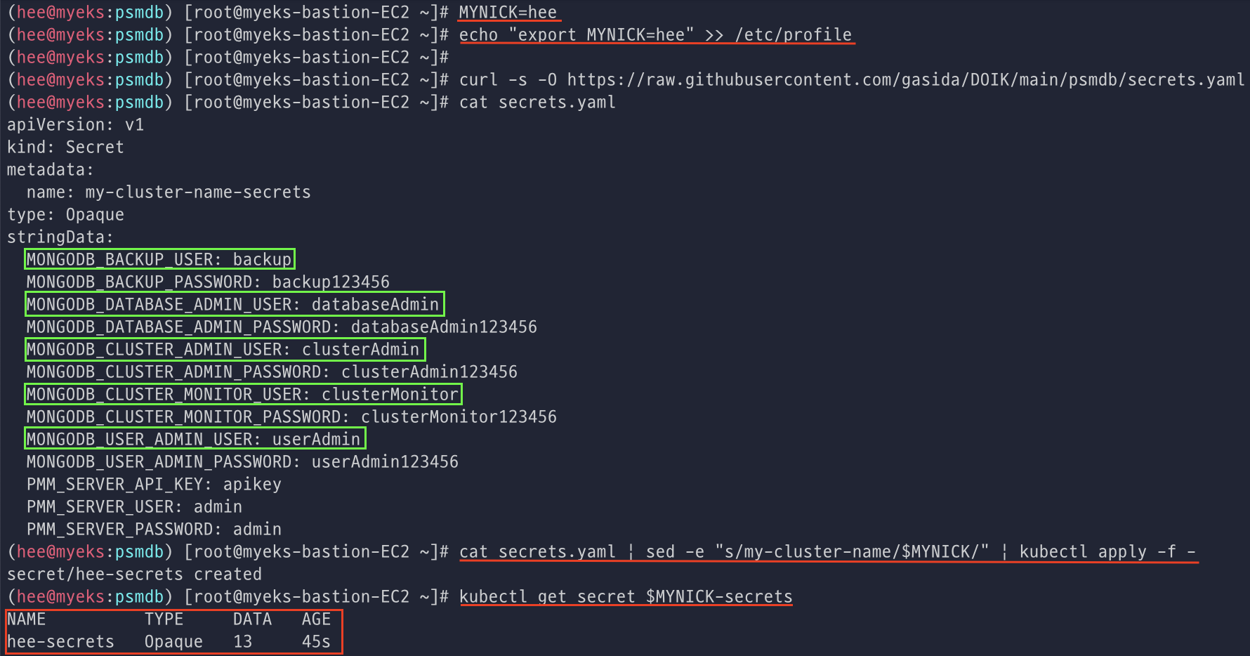 Cluster배포 전에 개인이 사용할 명으로 export후에 secret 생성한다.