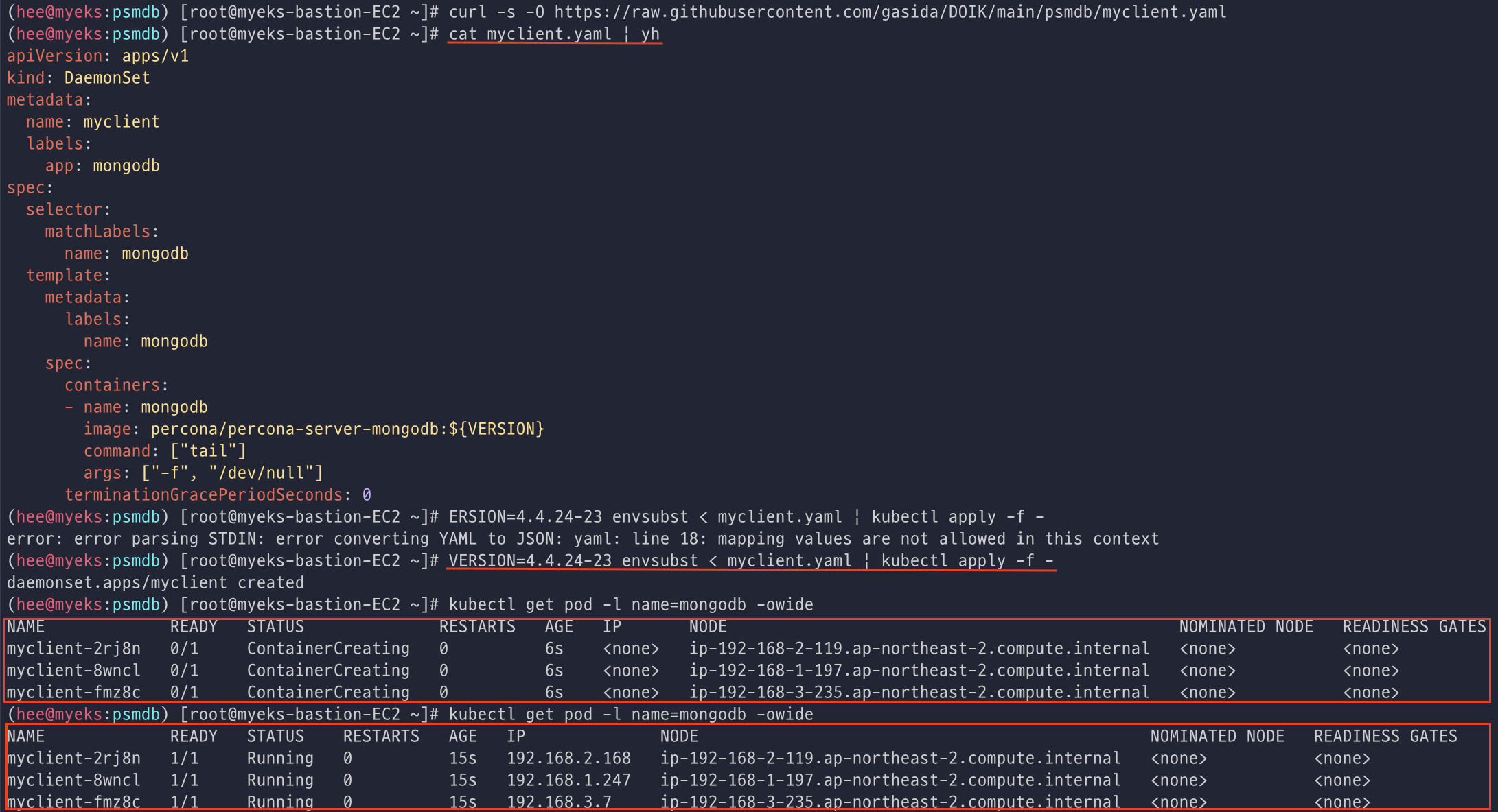 Demonset으로 myclinet pod를 새롭게 배포하고, 새로운 터미널을 열어서 클러스터에 접속한다. (Admin_User)