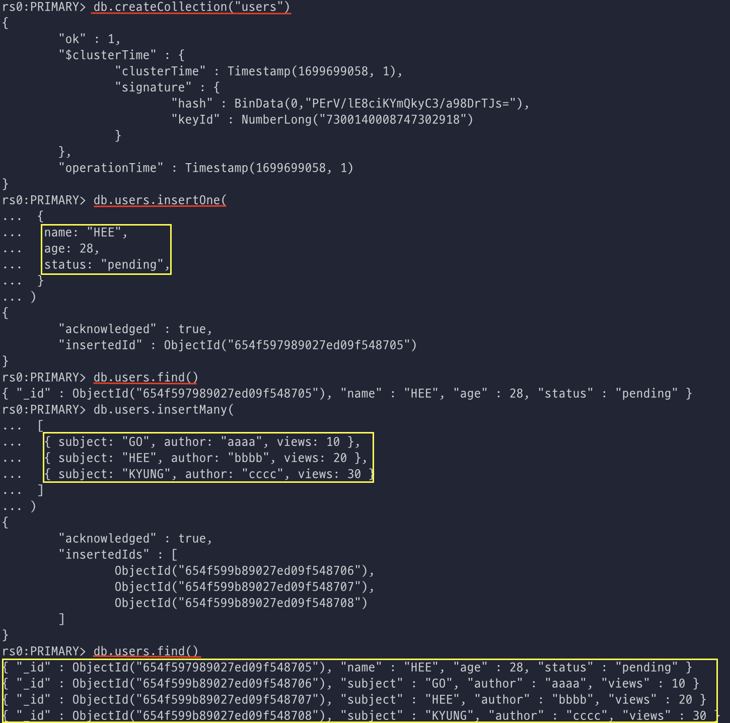 처음에 콜렉션을 생성하고, Document를 입력해준 뒤에 내가 입력한대로 데이터가 들어갔는지 확인해준다.