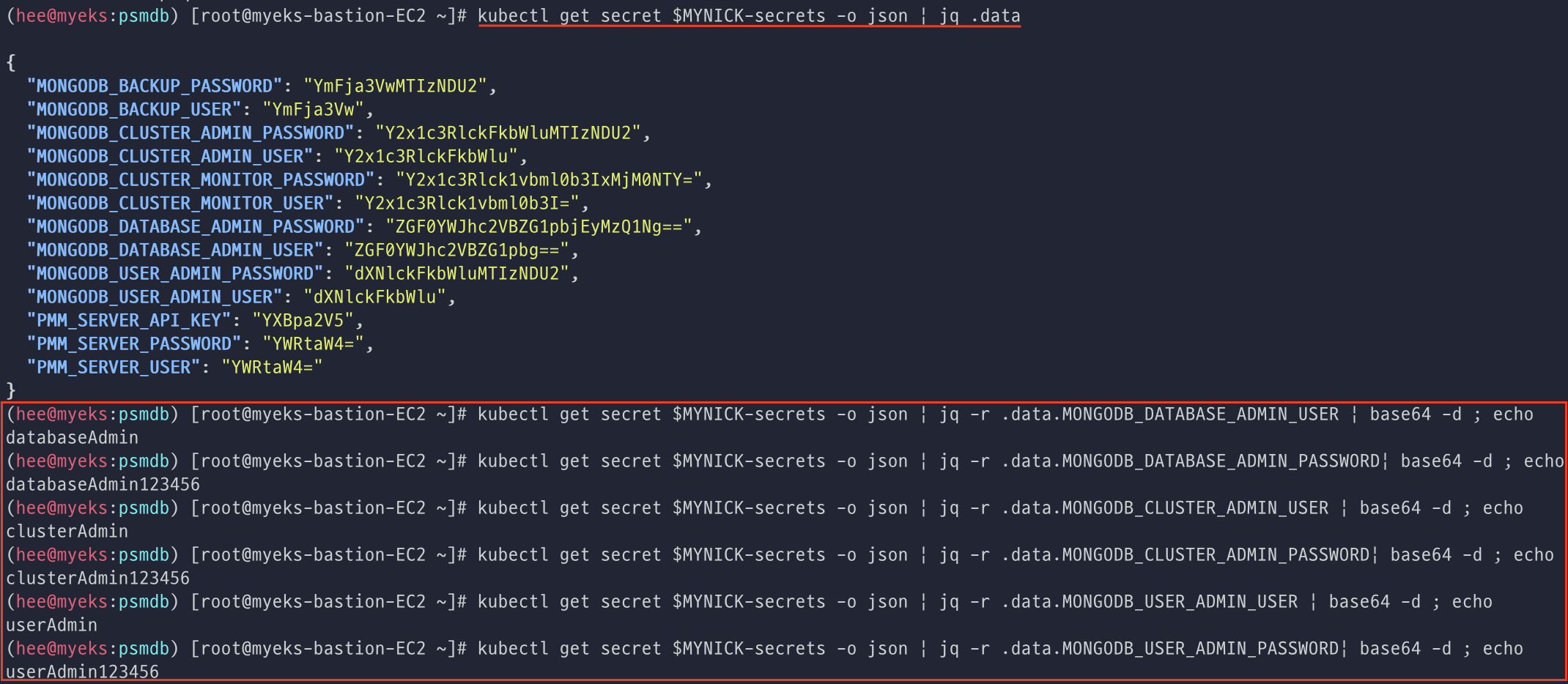 secret 파일을 보면 우리가 사용할 계정 몇 개를 확인할 수 있다. 계정별로 권한이 상이하다. (Cluseter Admin, Database Admin, User Admin 등)