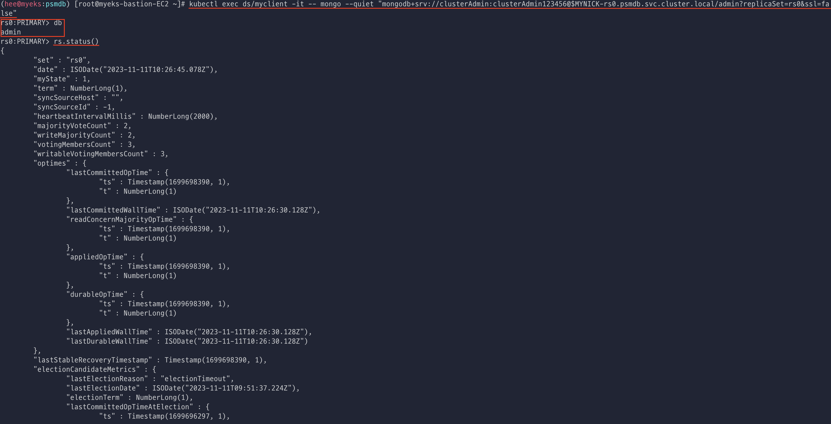 Cluster User 가 있는 두 번째 터미널에서 복제 셋 정보 및 상태를 확인한다. (좀 많은 데이터를 확인할 수 있음.)