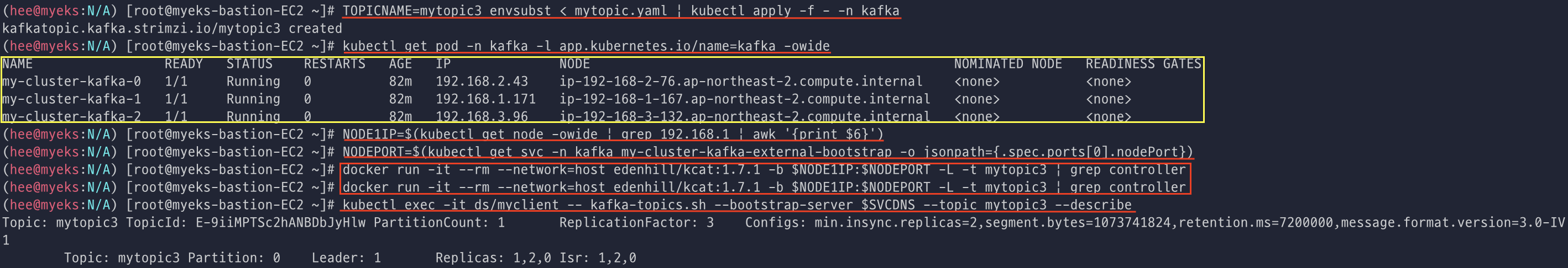 Topic을 하나 더 생성(파티션 1개 리플리케이션 3개, ISR=2)하고, 토픽 정보 확인하면서 컨트롤러 브로커 위치 확인한다.
