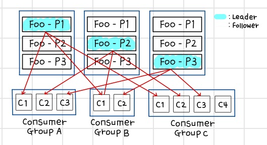 Foo와 Bar는 각각 3개의 파티션으로 나뉘어져 있으며, 이 각각의 파티션들은 3개의 복제본으로 복제가 된다. 3개의 복제본 중 하나의 리더가 선출되고(민트색) 리더가 모든 데이터의 읽기, 쓰기, 연산을 담당한다. 위에서 말한대로 이 파티션은 늘릴 수는 있지만, 절대 줄일 수는 없다. 파티션을 늘리고자 할 때는 파티션을 줄일 수 없음을 고려해서 결정해야한다.