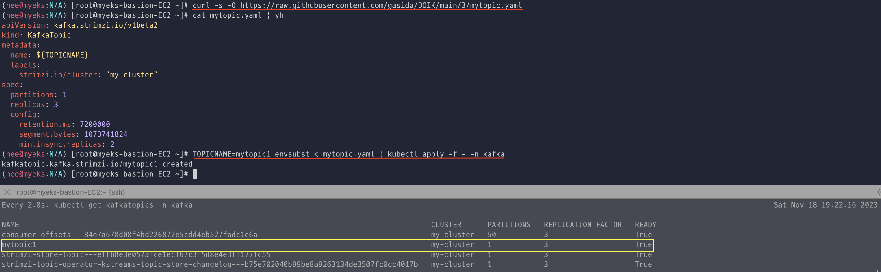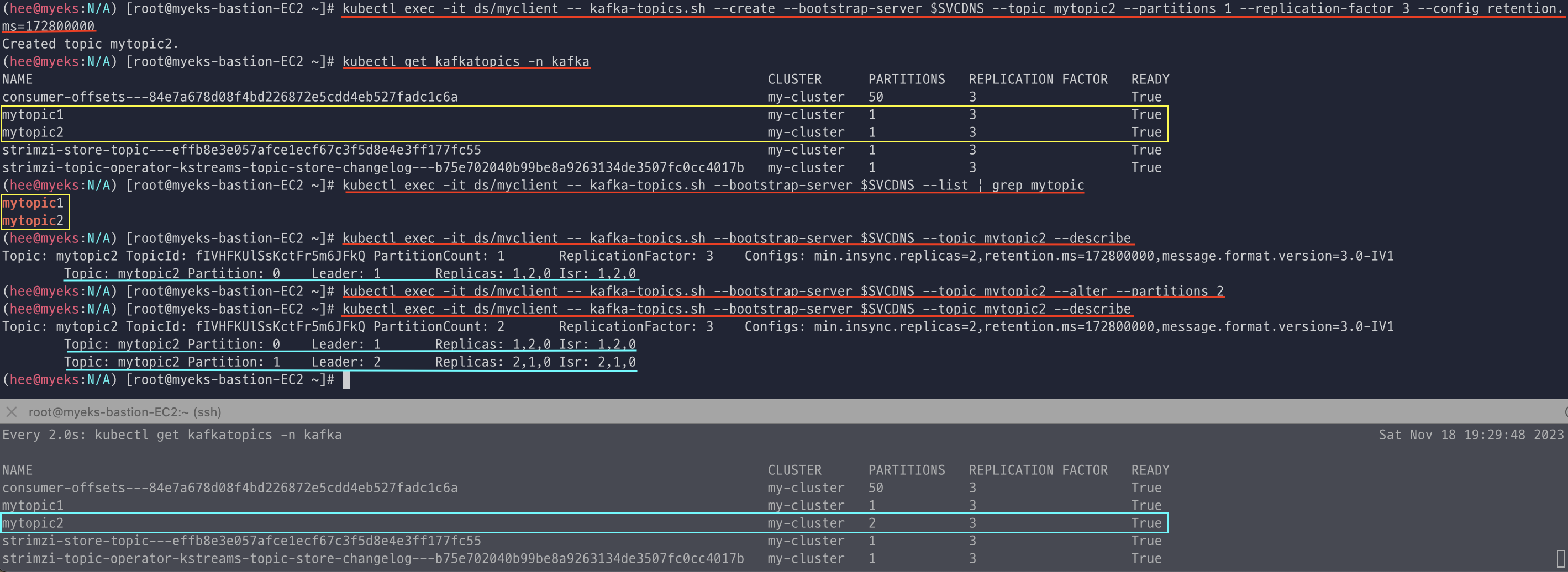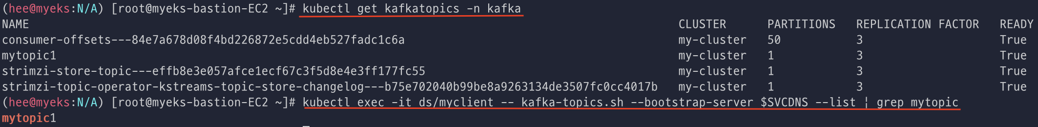 아래 모니터링 중이던 터미널에 mytopic1이 생성된 것을 실시간으로 볼 수 있었다.