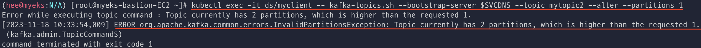 파티션 0번의 리더와 1번의 리더가 확인되고, 파티션 개수를 줄이려고 하면 아래와 같이 Error가 발생하는 것을 확인할 수 있다.