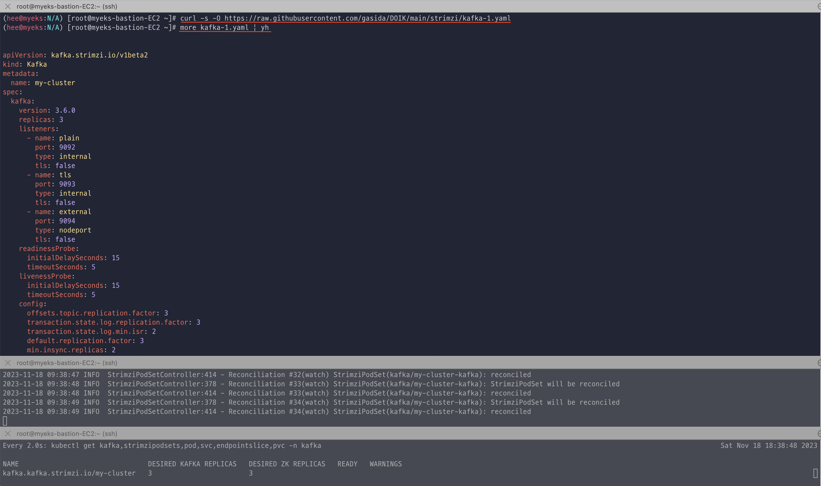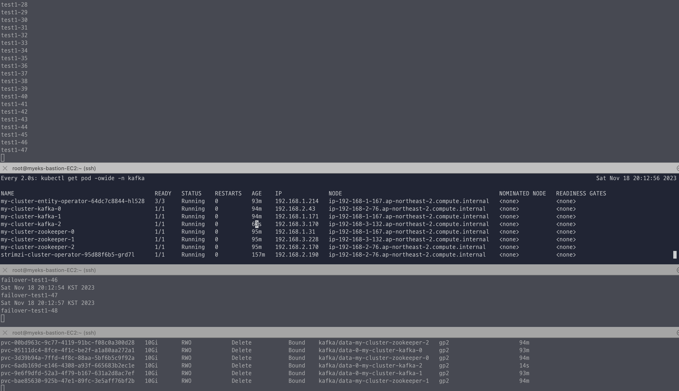 Kafka 클러스터 배포 전에 log, pod, pv 등을 새로운 터미널에 모니터링 걸어 놓고 배포를 진행하였다. (pod 배포 전에는 1개였는데 배포 후에 캡쳐해서 3개로 보임)