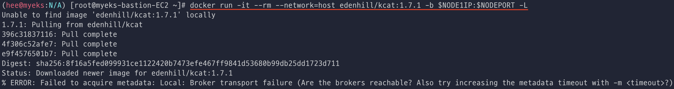 docker container로 kafkacat을 띄워 사용한다. (아마존 리눅스는 불편해서 docker로 실행하게끔 구성하셨다고 하신다.)