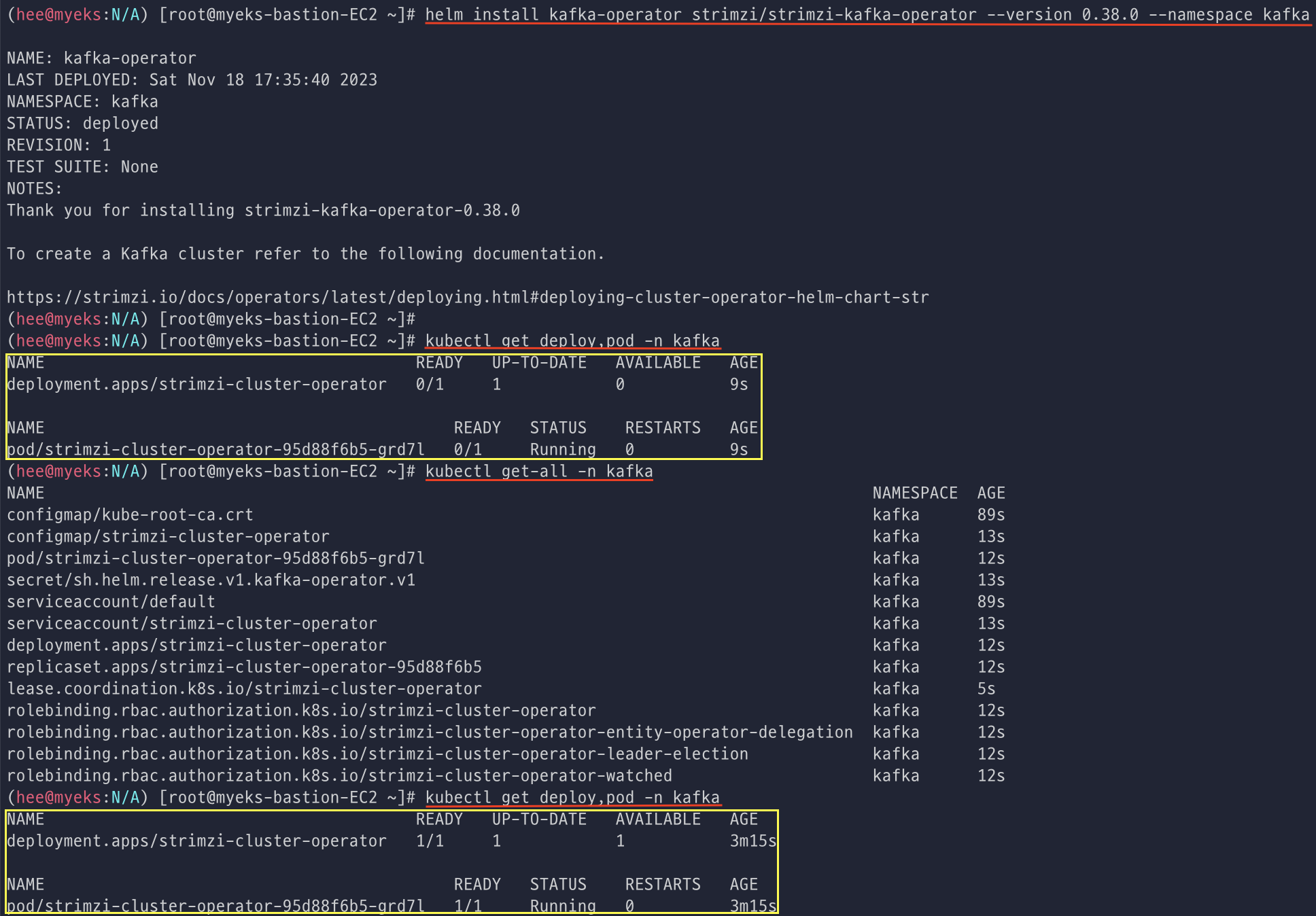 helm으로 kafka-operator 설치 후 deploy, pod를 확인해본다.