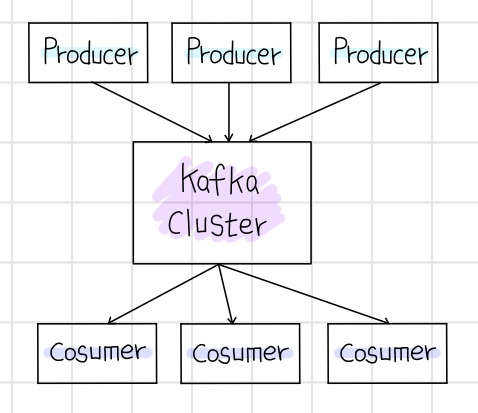 Kafka 클러스터를 중심으로 프로듀서(Producer)와 컨슈머(Consumer)가 데이터를 Push하고 Pull하는 구조이다. 프로듀서(Producer), 컨슈머(Consumer)는 각기 다른 프로세스에서 비동기로 동작하고 있다.