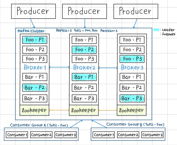프로듀서(Producer)가 데이터를 Kafka에 적재하고 있으며, 저장된 데이터를 컨슈머 그룹(Consumer Group) A와 B가 각각 자신이 처리해야할 Topic Foo와 Bar를 가져온다. Foo와 Bar는 각각 3개의 파티션으로 나뉘어져 있으며, 각각의 파티션들은 3개의 복제본으로 복제가 된다. 3개의 복제본 중 하나의 리더가 선출되고, 선출된 리더가 모든 데이터의 읽기, 쓰기, 연산을 담당한다. 파티션들은 운영 도중 그 수를 늘릴 수 있지만 절대 줄일 수는 없다. 그렇기 때문에 파티션을 늘리고자 할때는 파티션을 줄일 수 없는 부분을 충분히 고려한 다음에 늘려야 한다.