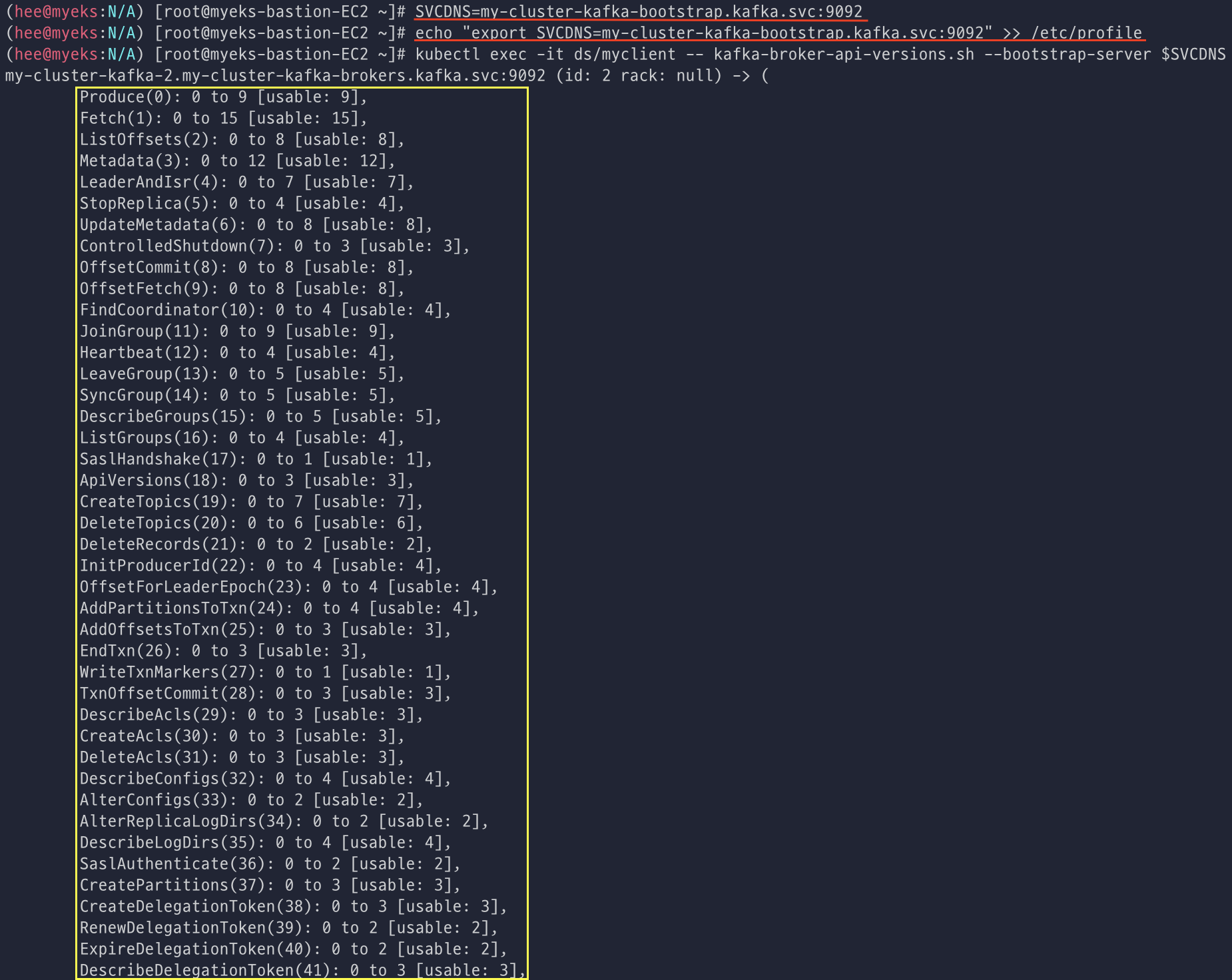 operator가 지원하는 kafka 버전 확인해본 뒤에 배포된 리소스도 확인한다.