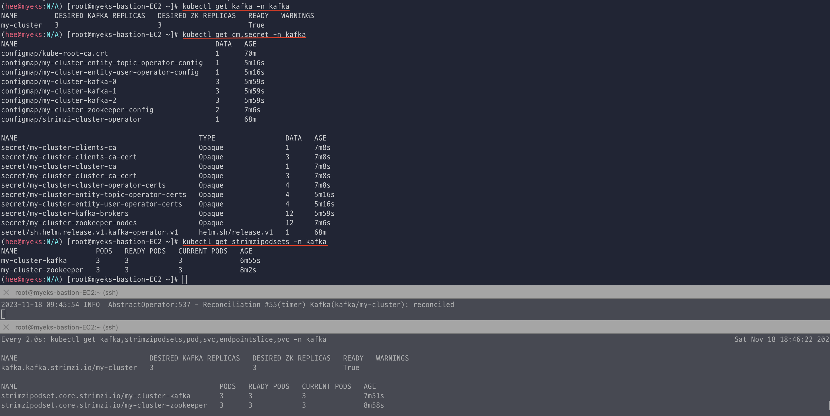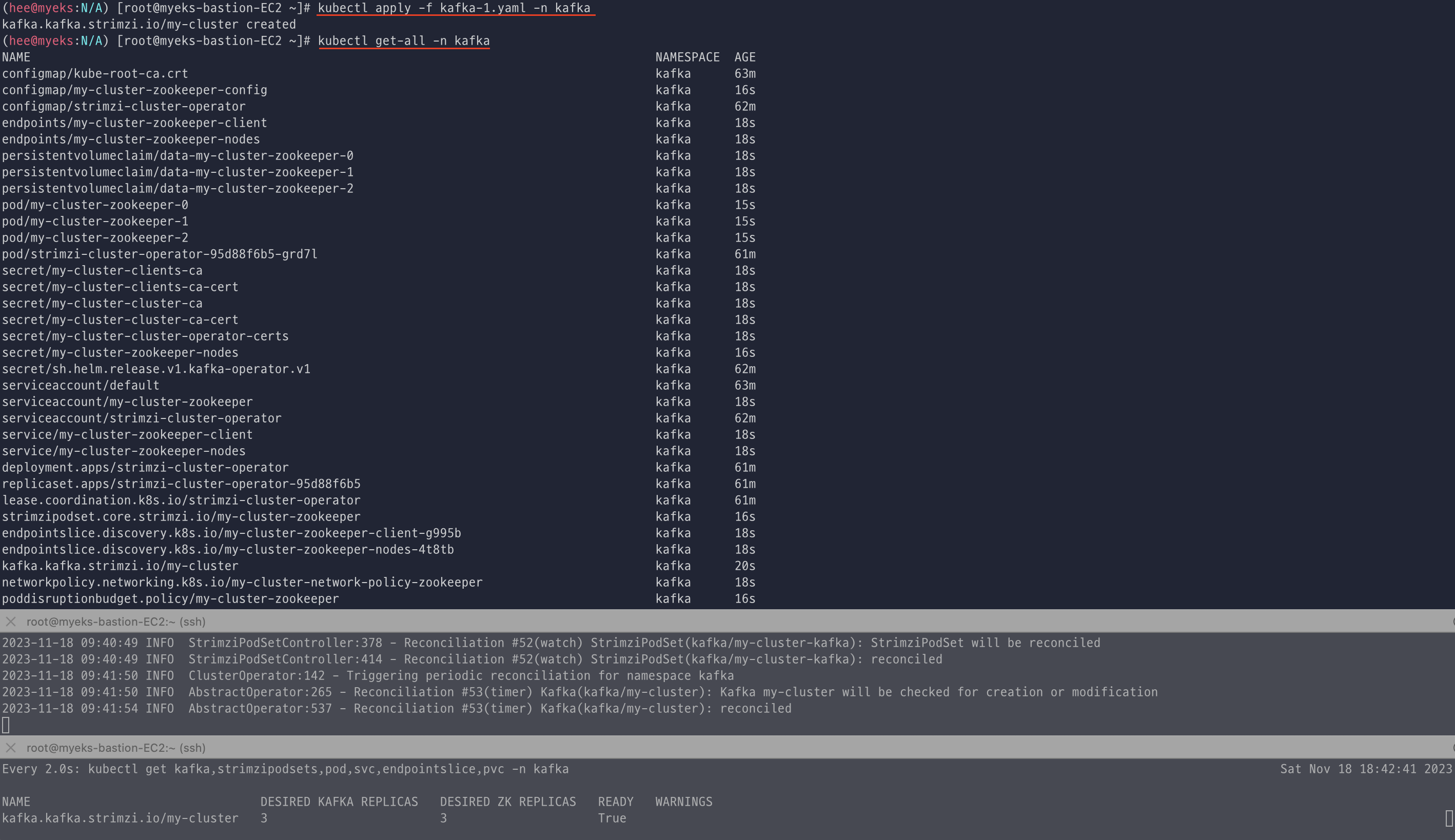 배포된 리소스를 확인하면 kafka, zookeeper strimzipodsets 생성 확인한다. (각각 3개가 배포 되었고, 상태가 READY가 맞는지 확인)