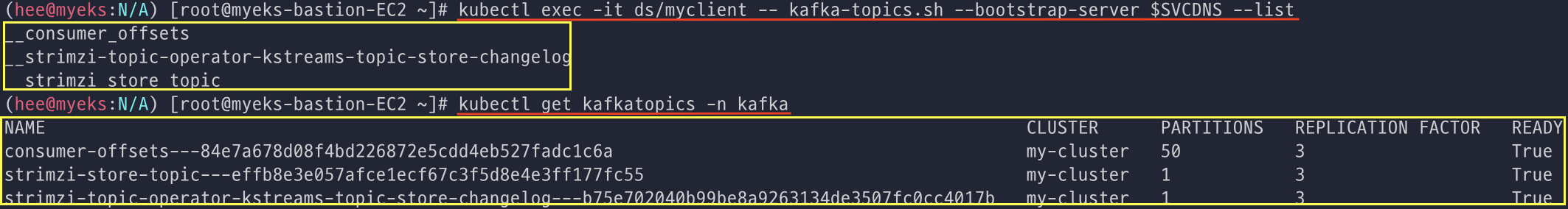 토픽(DB 스키마 같은 느낌) 리스트를 확인 및 kafkacopic을 한번 더 확인한다.