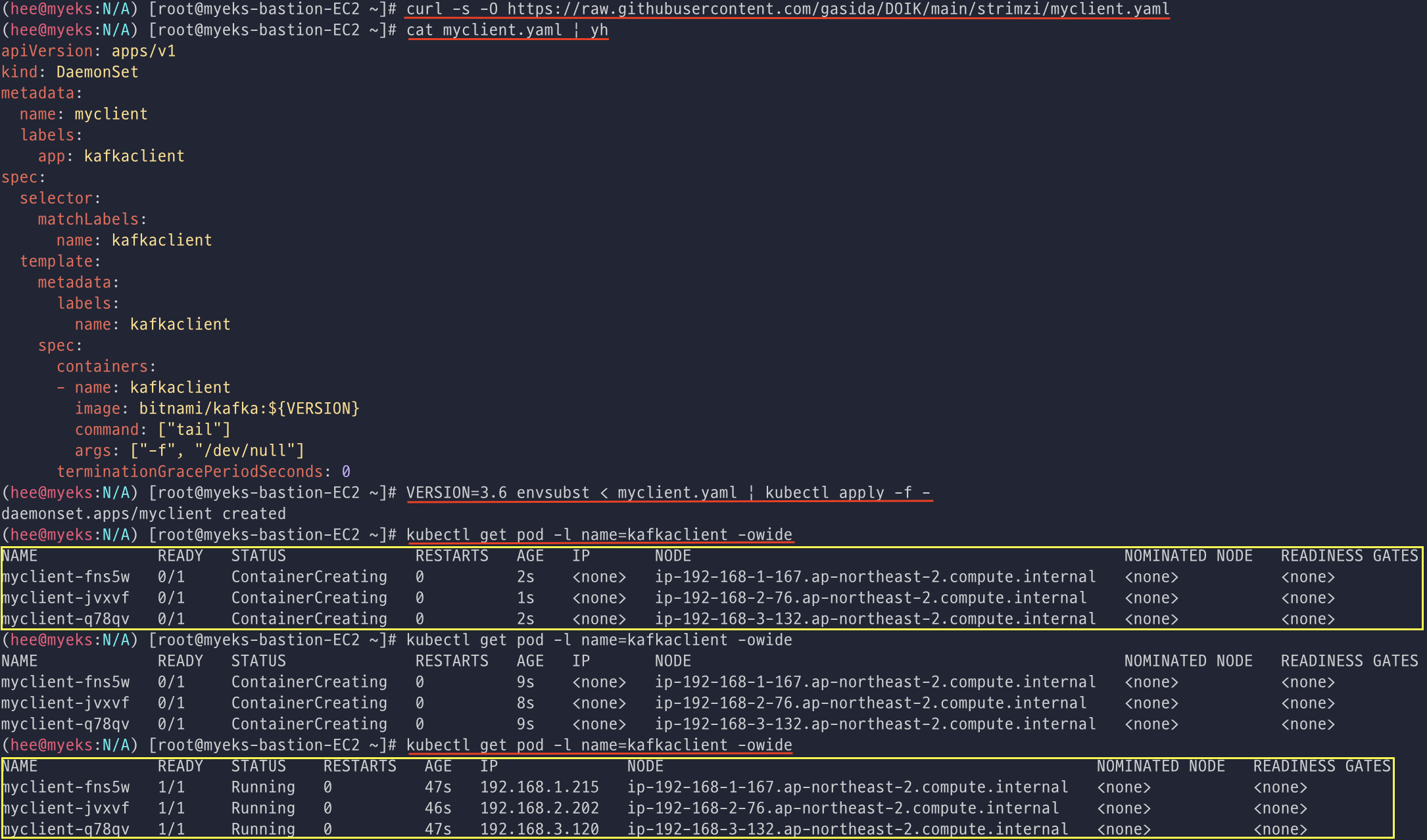 테스트 pod를 만들어서 데몬셋으로 배포한 후에 확인하면 myclient pod가 생성된 것을 확인할 수 있다. (kafka client)