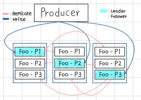 - 리더, 팔로워(Leader, Follower): 카프카에서는 각 파티션당 복제된 파티션 중에 하나의 리더가 선출되고, 리더는 모든 읽기, 쓰기 연산을 담당함. 리더를 제외한 나머지는 팔로워가 되고, 팔로워들은 리더의 데이터를 복사하는 역할을 함.