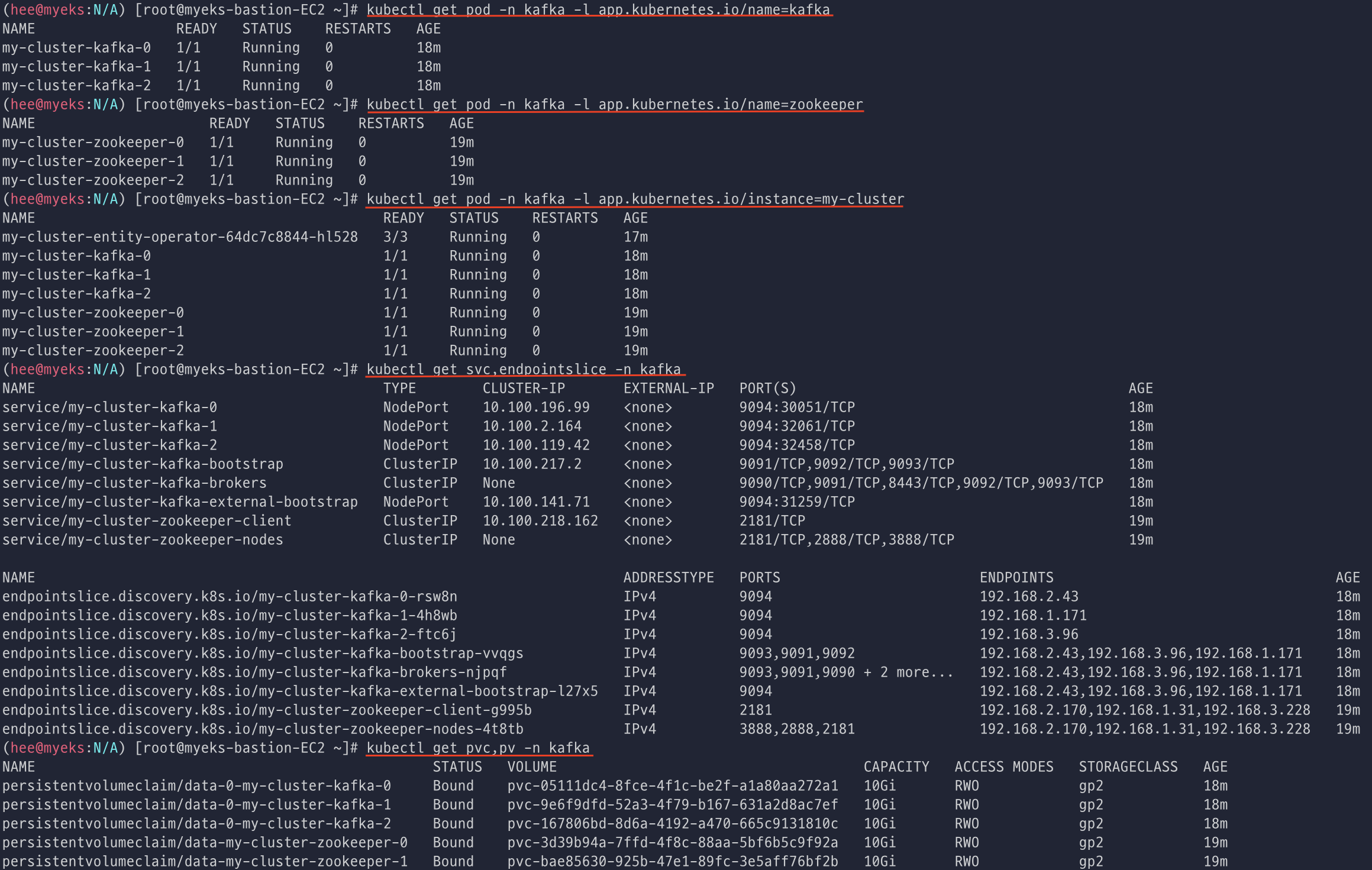 kafka, zookeeper Pod 확인 및 서비스 정보와 PV를 확인한다.