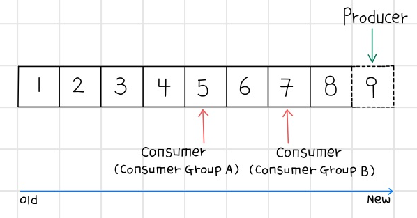 컨슈머 그룹의 각 컨슈머들은 파티션의 오프셋을 기준으로 데이터를 순차적으로 처리한다(FIFO). 컨슈머들은 컨슈머 그룹으로 나뉘어서 데이터를 분산 처리하게 되고 같은 컨슈머 그룹 내에 있는 컨슈머끼리 같은 파티션의 데이터를 처리 할 수 없다. 파티션에 저장되어 있는 데이터들은 순차적으로 데이터가 저장되어 있고, 데이터들은 설정값에 따라 데이터를 디스크에 보관하게 된다. (2.x기준 default 7Days)