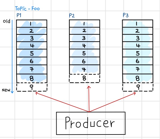 카프카 데이터는 순차적으로 데이터를 디스크에 저장한다. 그렇기에 프로듀서는 순차적으로 저장된 데이터 뒤에 붙이는 append 형식으로 write 연산을 진행하게 된다. 이 때 파티션들은 각각의 데이터가 순차적으로 집합된 오프셋(offset)으로 구성되어 있다.
