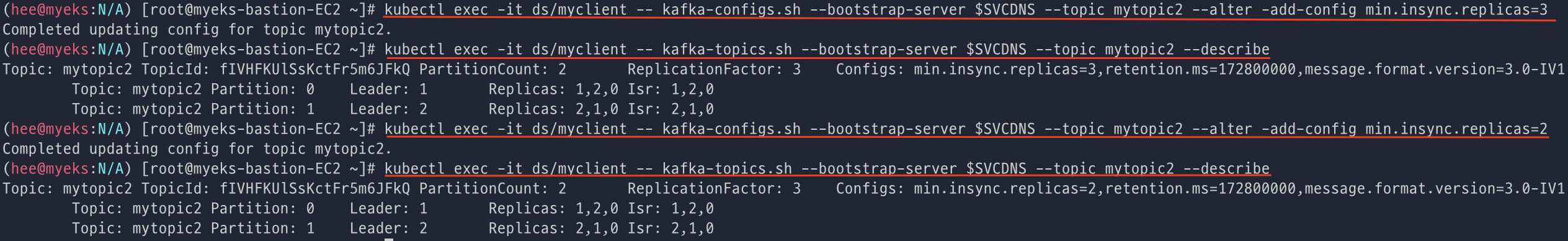 kafka min.insync.replicas=2 를 min.insync.replicas=3으로 변경도 진행해보고 다시 원복하였다.