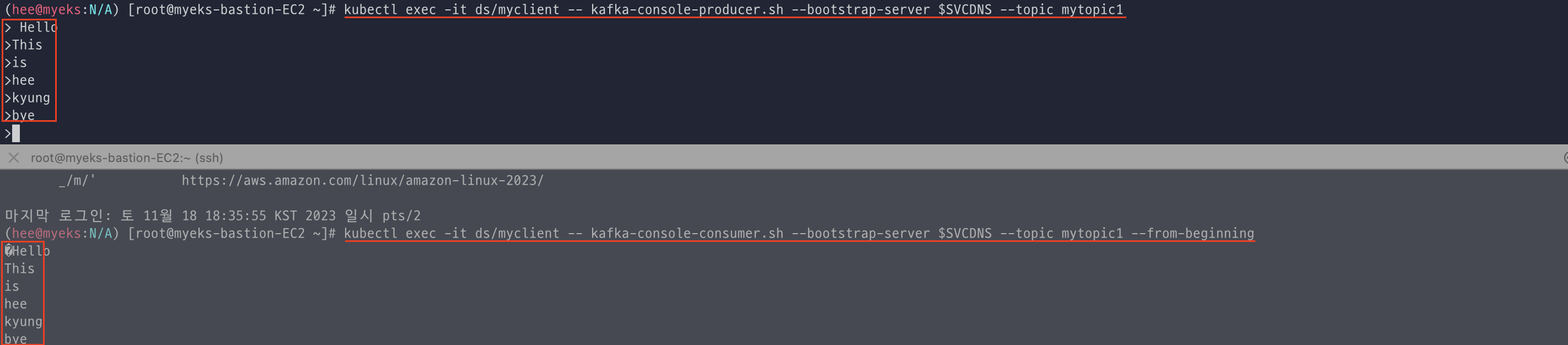 터미널을 하나 더 추가해서 for문을 사용헤 메시지를 계속 넣고 한쪽에는 메시지를 잘 받는지 확인해봤다.