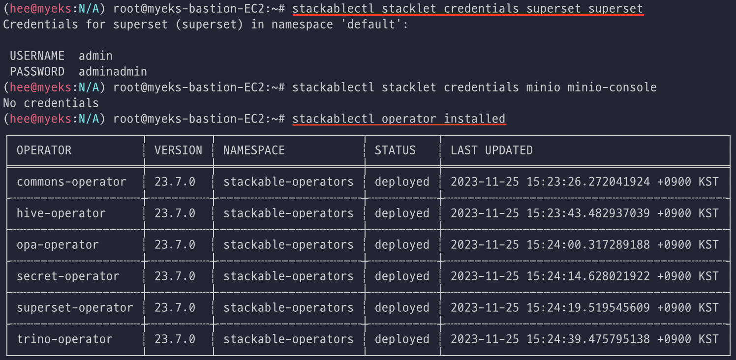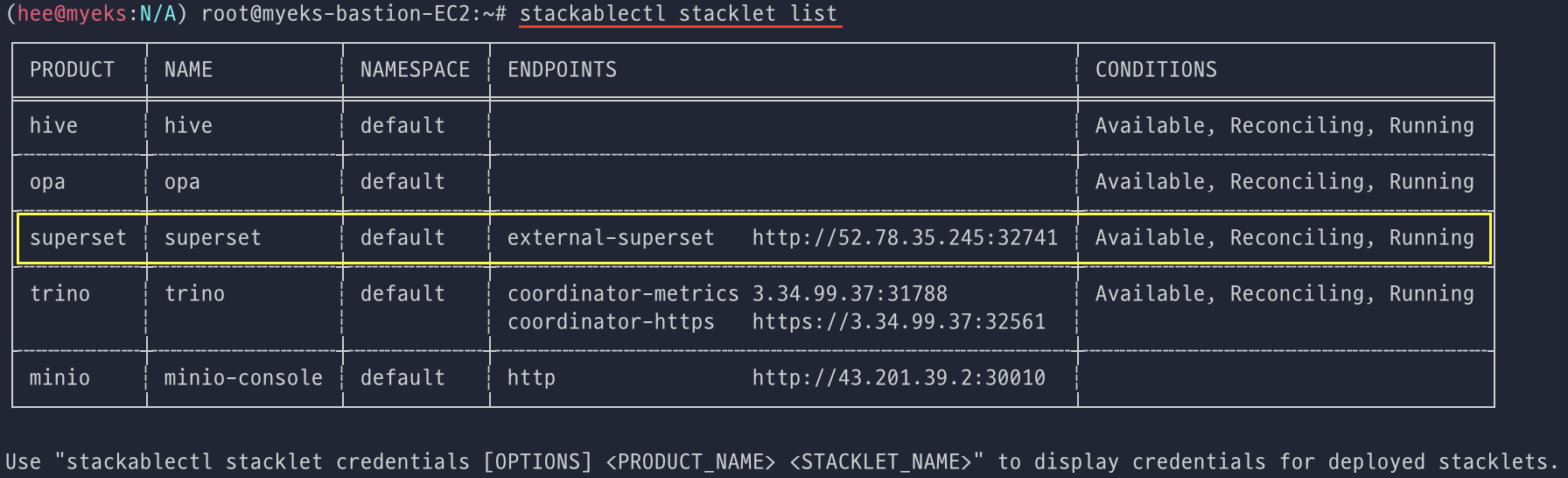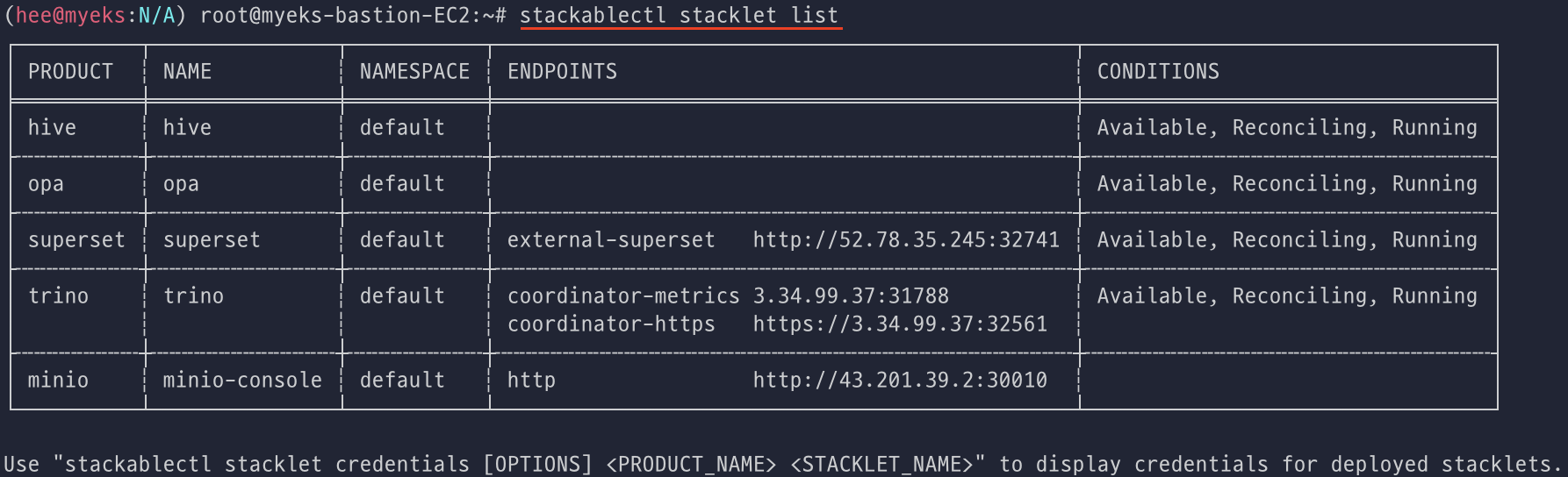 많은 pod들이 배포가 된 것으로 보이며, 배포한 뒤에 stackablectl stacklet list 명령어를 사용해서 현재 배포된 정보를 볼 수 있다.