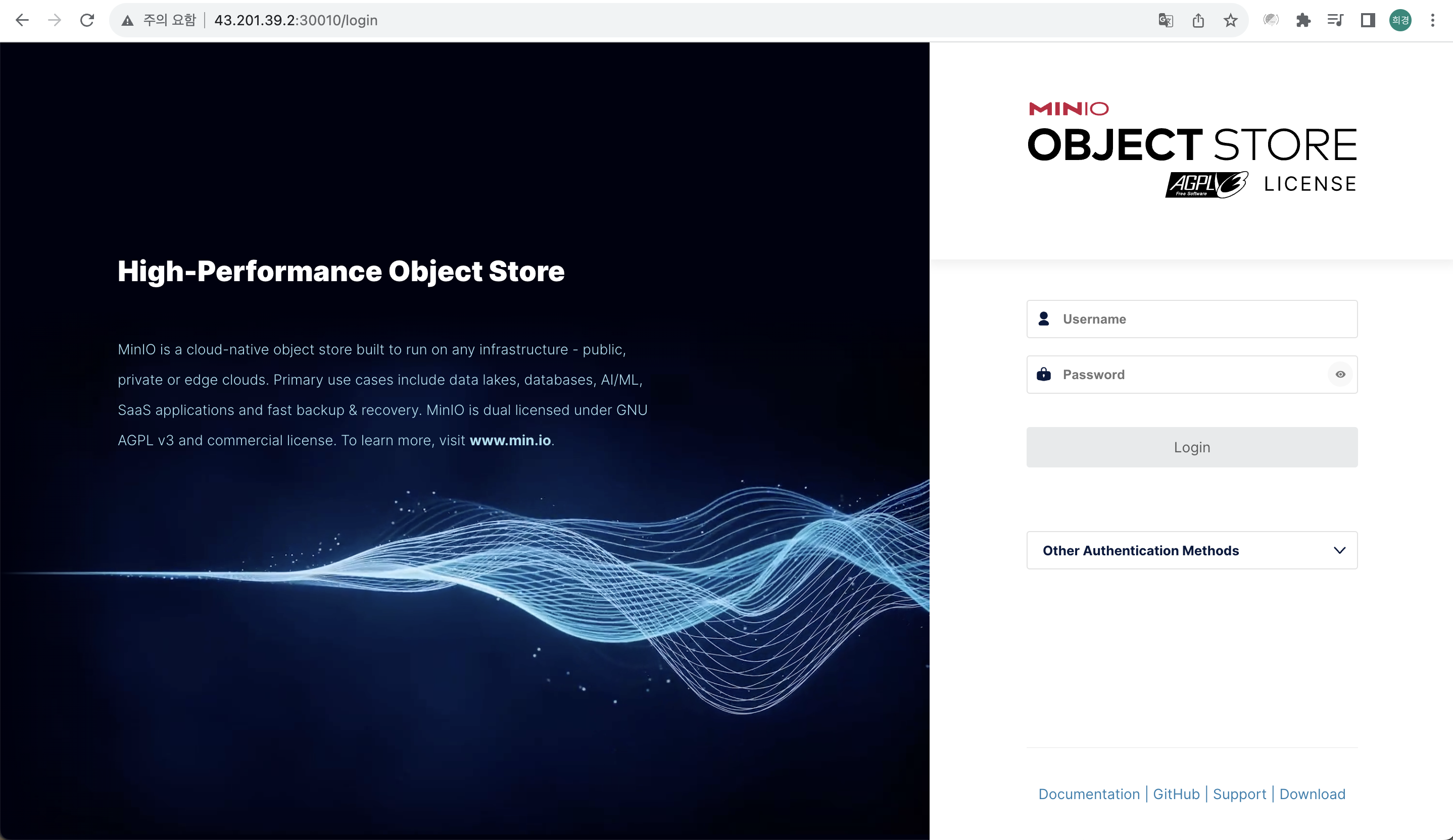 minio endpoints에 있는 저 링크를 통해 접속하면 web 화면을 볼 수 있다.
