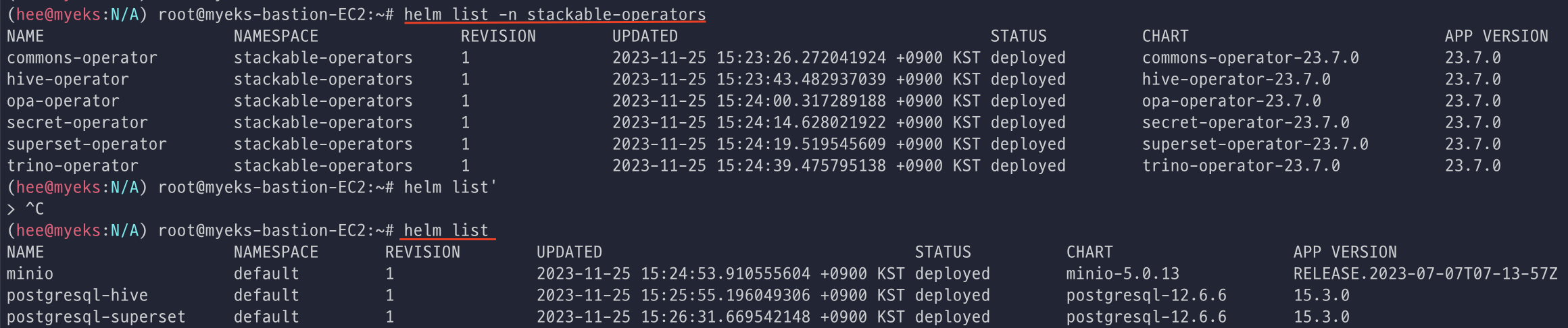 stackable도 helm 차트를 사용하며, 설치 완료 후에 확인해보니 필요한 서비스들이 구성된 것으로 보인다.