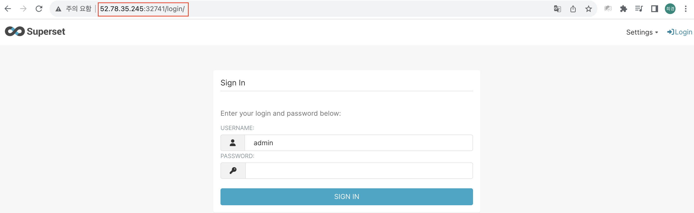 superset도 stackablectl stacklet list 명령어를 통해 확인한 endpoints 경로로 접근 가능하다.