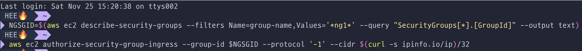aws ec2 authorize-security-group-ingress --group-id $NGSGID --protocol '-1' --cidr $(curl -s ipinfo.io/ip)/32