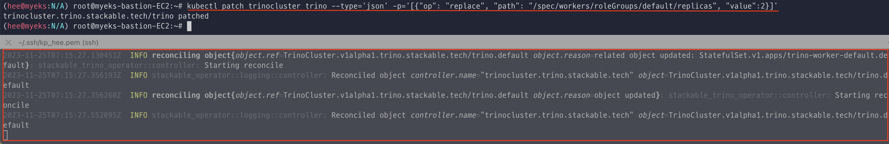 trino를 2로 바꾸면 operator가 바뀐내용을 확인하고 worker node를 1대 더 기동한다.