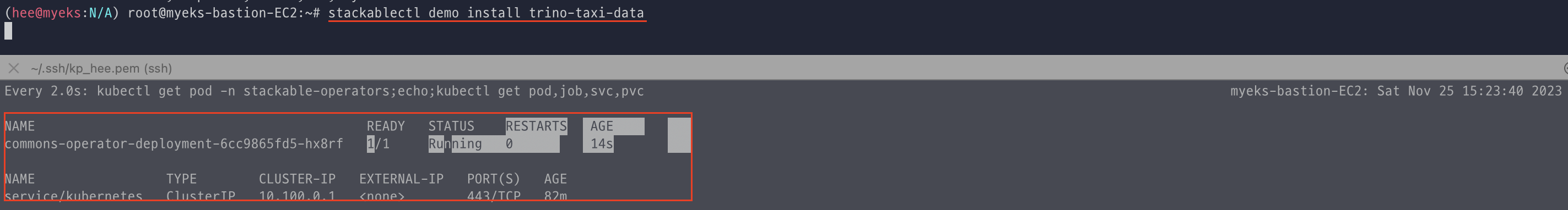 watch -d "kubectl get pod -n stackable-operators;echo;kubectl get pod,job,svc,pvc"