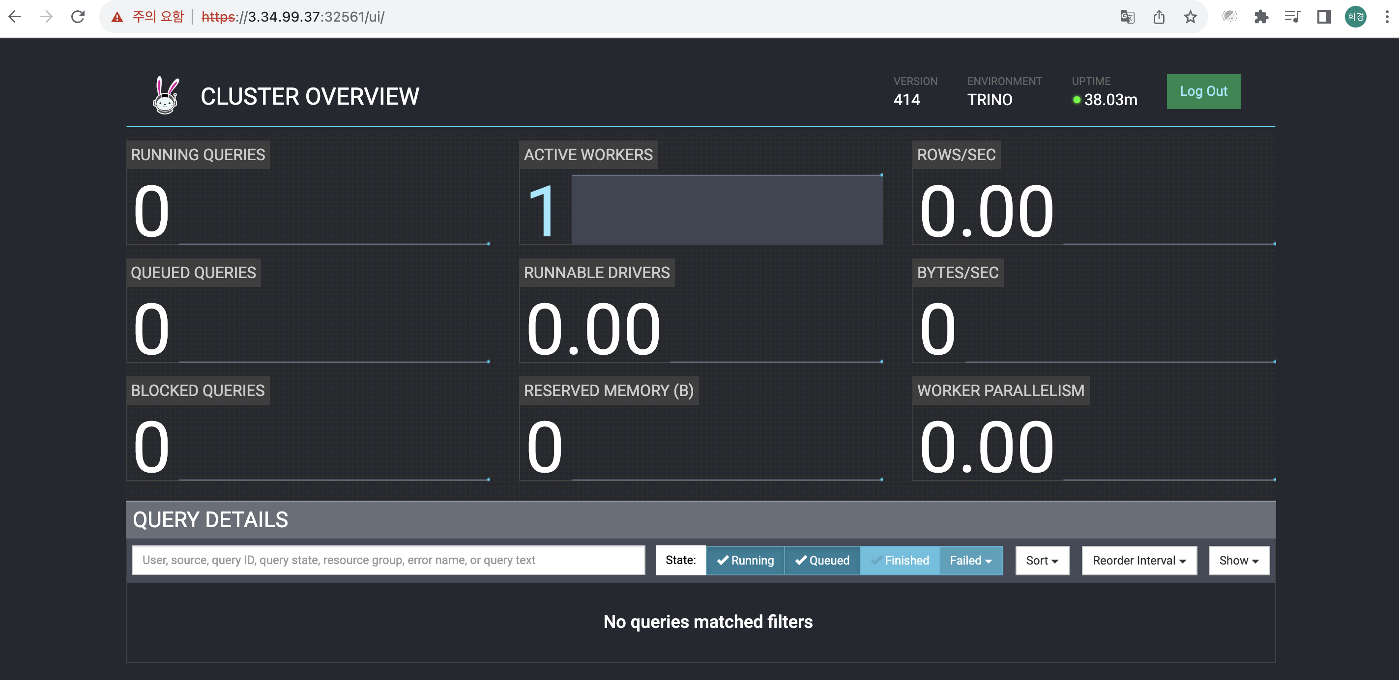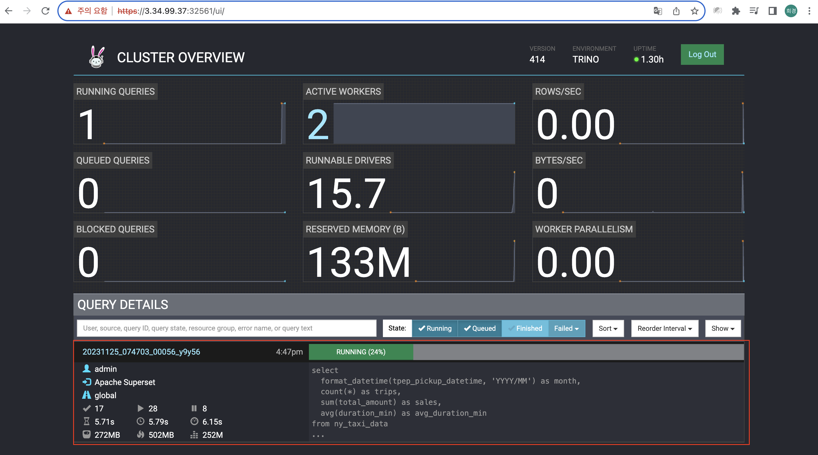 Taxi data를 클릭하니 인피니티 모양이 나오면서 연산(?)을 열심히 하는 걸로 보이고, trino dashboard를 보니까 아까와 다르게 쿼리를 확인 할 수 있었다.