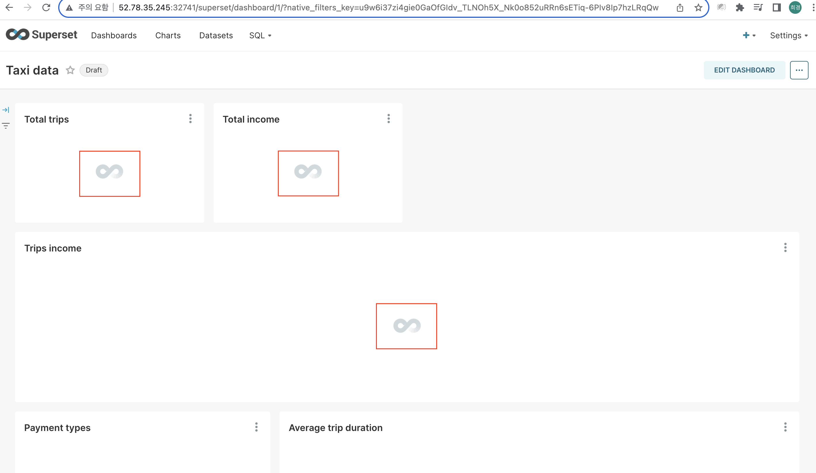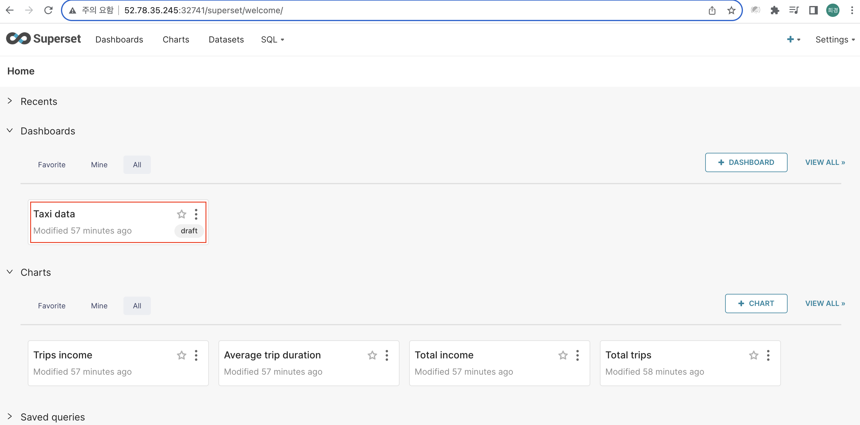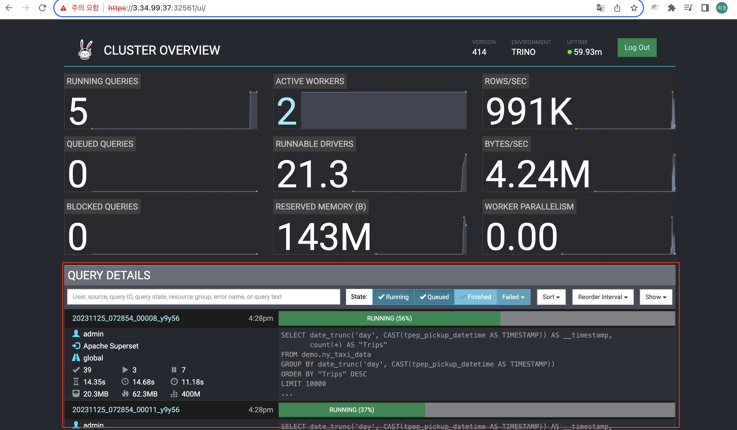 superset의 Dashboard에 있는 Taxi data를 클릭하면, trino로 쿼리가 들어가는 것을 실시간으로 볼 수 있다.