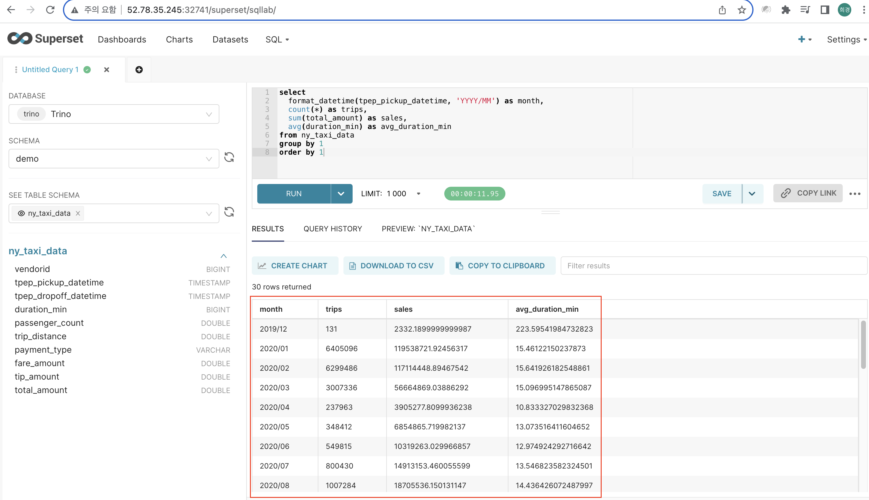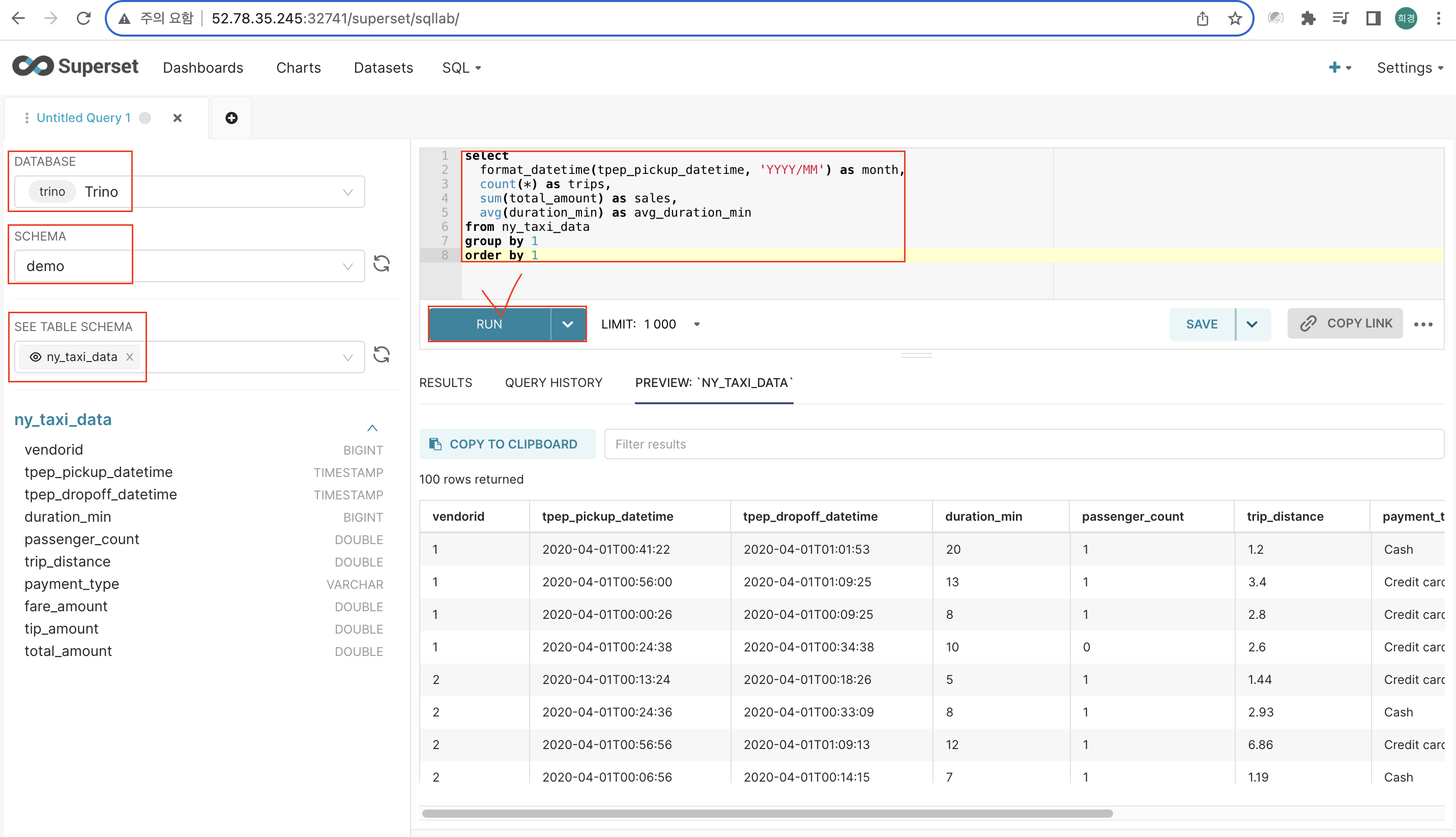 Superset에서도 data query가 가능하여, superset에서 query를 실행해보았다.