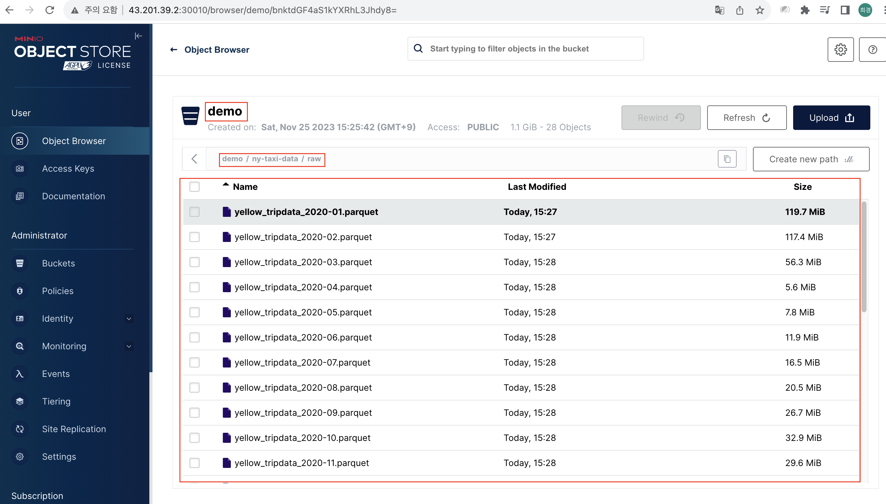 로그인을 하면 demo라는 버킷(s3와 비슷한 것)을 볼 수 있는데 클릭해서 보면 데이터들을 확인할 수 있다.