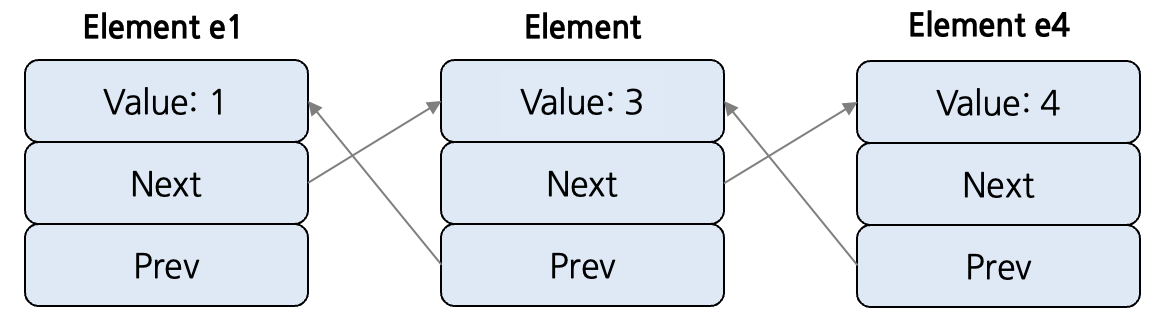 e1의 Next 포이너는 다음 요소인 e4 인스턴스를 가르키고 e4의 Prev 포인터는 이전 요소인 e1 인스턴스를 가리키게 됨.