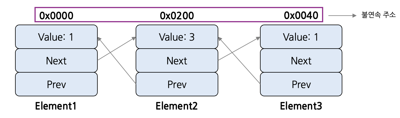 ✓ 이전 요소도 요Prev 포인터로 가지고 있음.