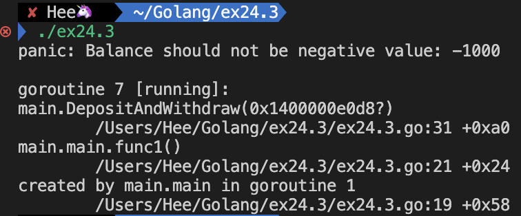 - 뮤텍스는 동시에 고루틴 하나만 확보할 수 있고, mutex.Lock() 메서드를 먼저 차지한 고루틴만 잔고를 수정할 수 있음.