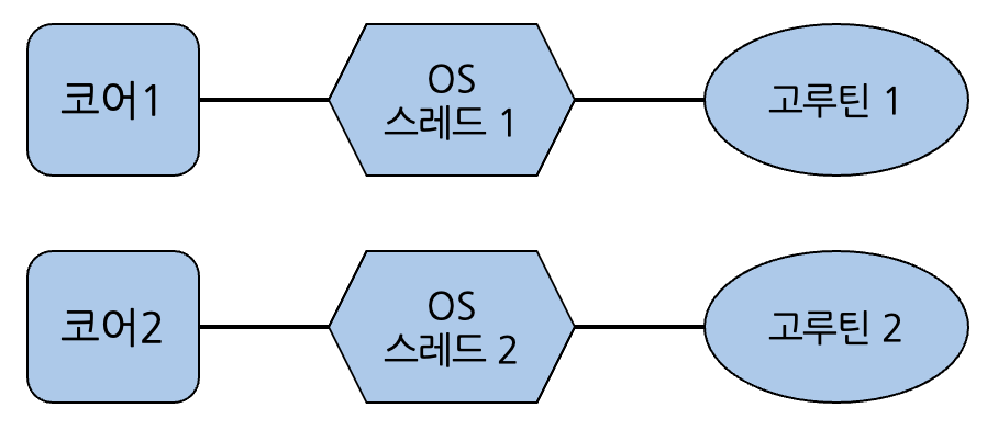 - 두 번째 고루틴이 생성되고, 두 번째 코어가 남아있으면 두 번째 OS 스레드를 생성하여 두 번째 고루틴을 실행할 수 있음.