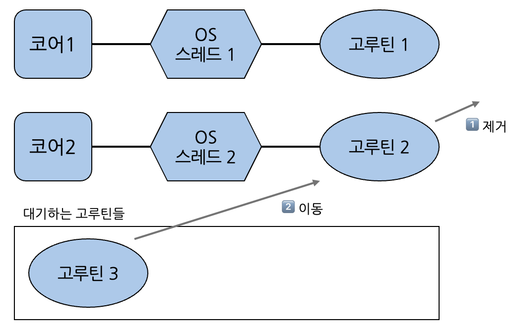- 만약, 두 번째 고루틴이 모두 실행 완료되면, 고루틴 2는 사라지게 되고 코어 2가 비게 됨.