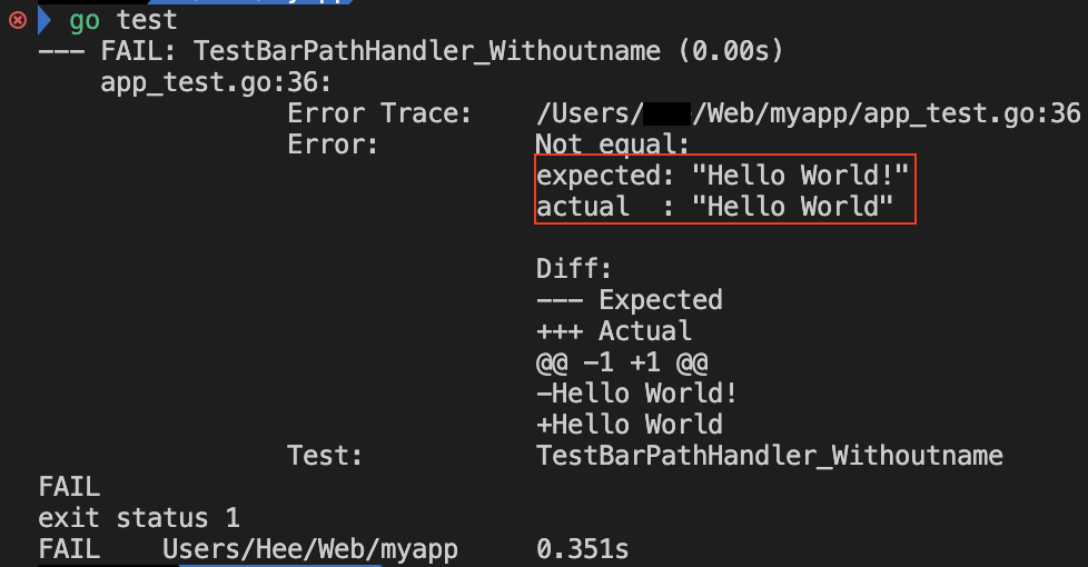 - 저장 후에 go test를 돌리면, Fail이 발생하고 내용을 보면 실제 "Hello world!"가 왔다는 것을 확인할 수 있음.