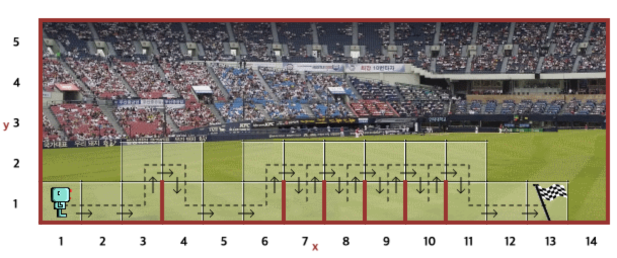 Q. 블록 어딘가에 깃발이 있으며, at_goal()에 도달할 때 끝나는데 블록 높이와 형태가 매번 바뀌어도 통과할 수 있어야함.