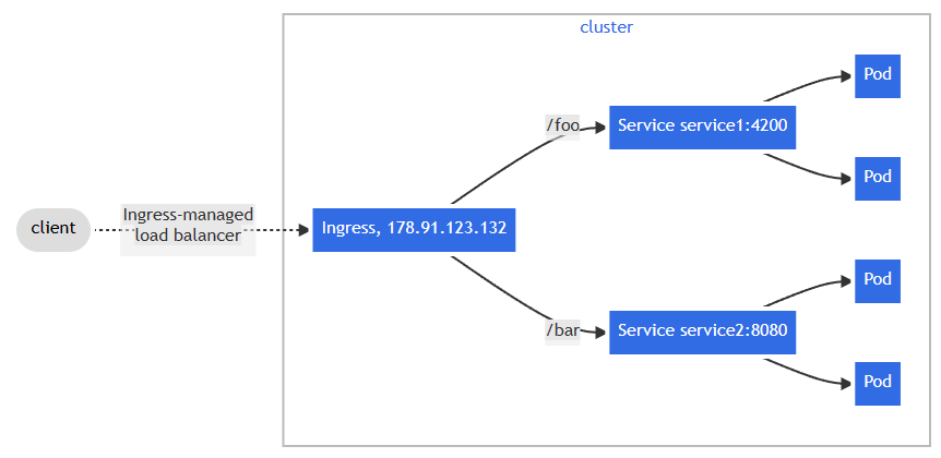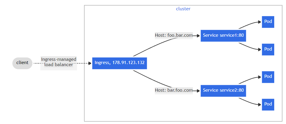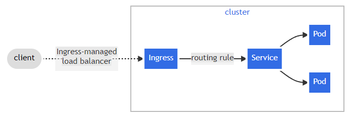 인그레스를 통해 외부에서 접근한 트래픽을 분산하는 간단 예시이다. (공식문서)인그레스는 외부에서 서비스 접속이 가능한 URL, LB Traffic, SSL/TLS, 도메인 기반 가상호스팅 제공, 특정 경로의 라우팅 등의 규칙을 정의한 자원이며, 실제로 동작을 하는 것은 Ingress-Controller이다.